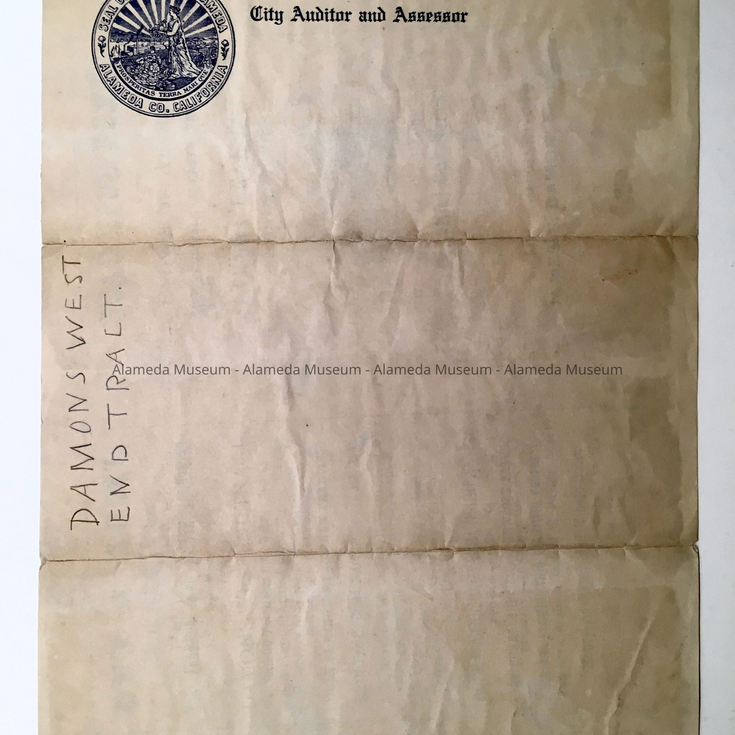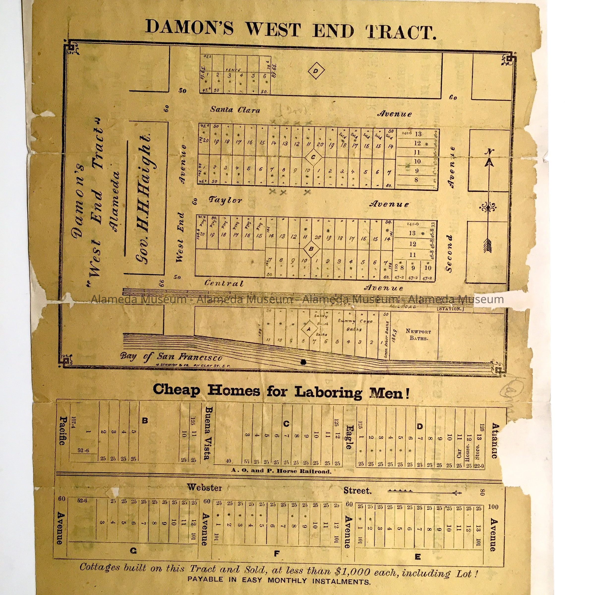 Real estate flyer announcing the sale of property in Damon's West End tract located on Central, Taylor, and Santa Clara Avenues between West End Avenue (now known as Fourth Street) and Second Avenue (now known as Fifth Street).
