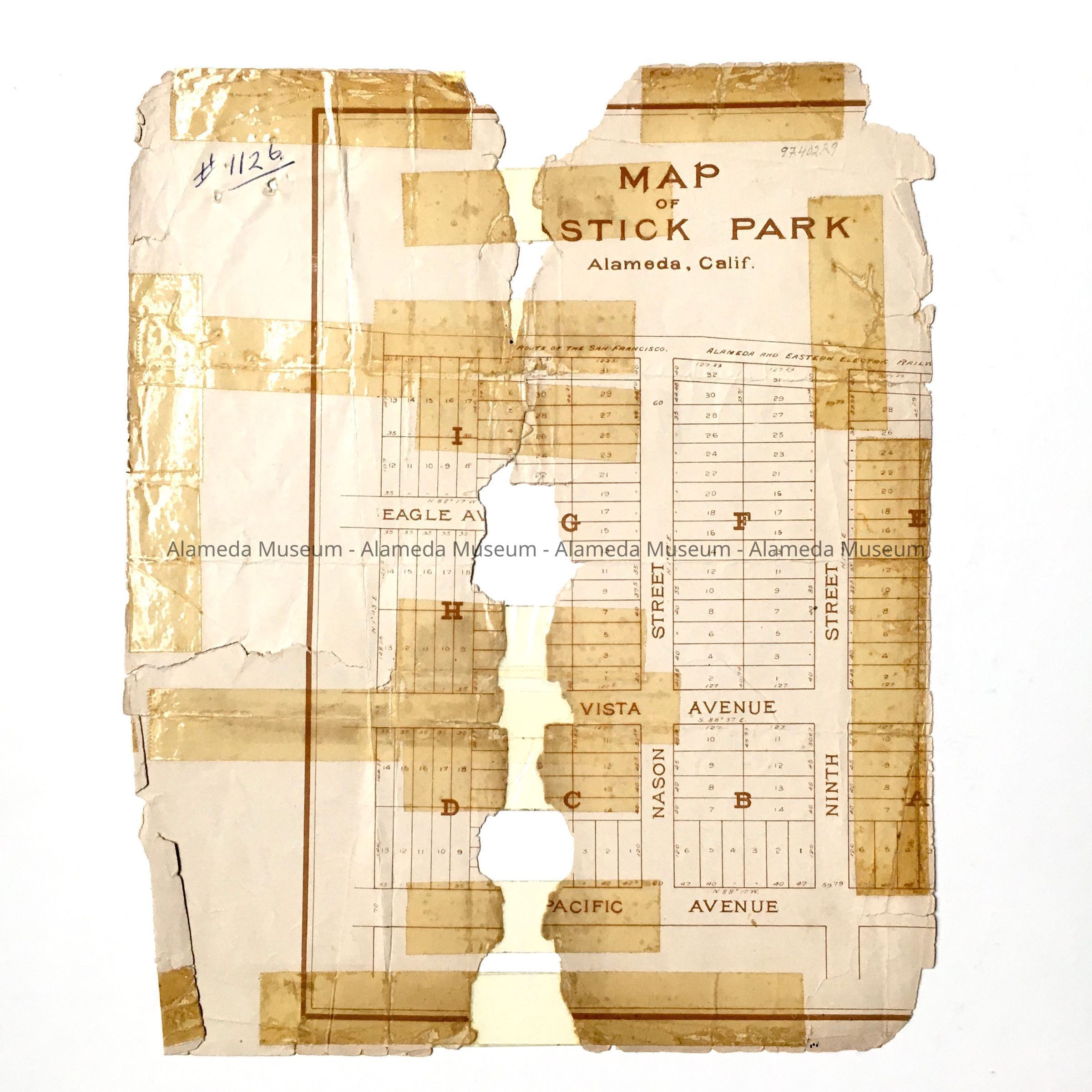 10/14/2023 MvL: a sticky label is found on the plastic sleeve stating in typed capital letters: ‘MAP OF MASTICK PARK TRACT/EAGLE, BUENA VISTA, AND PACIFIC AVENUES, NASON AND NINTH STREETS’