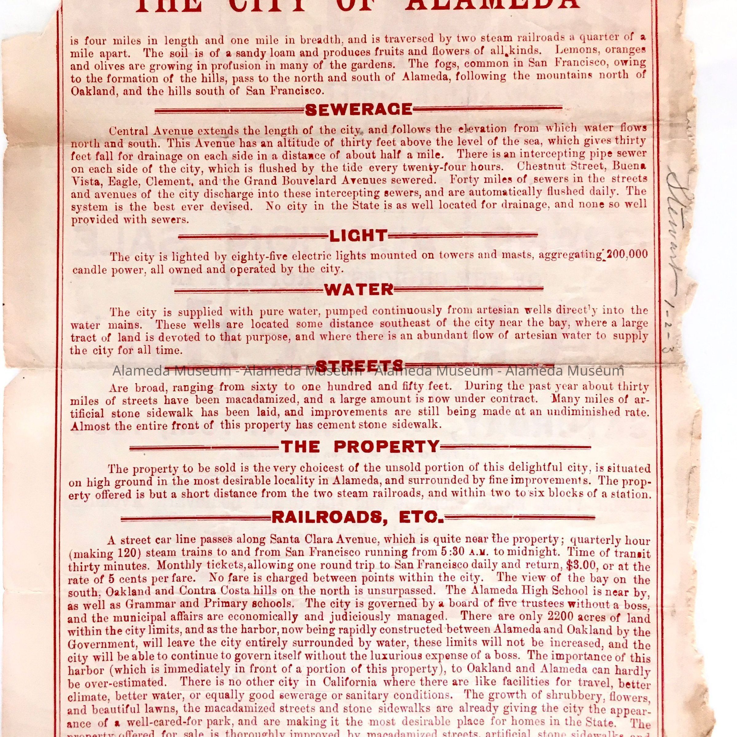 Two-page flyer. Cover has bold-printed caption, “Alameda” in red-colored type on an off-white colored background. Flyer in poor condition and now in 2 sections.