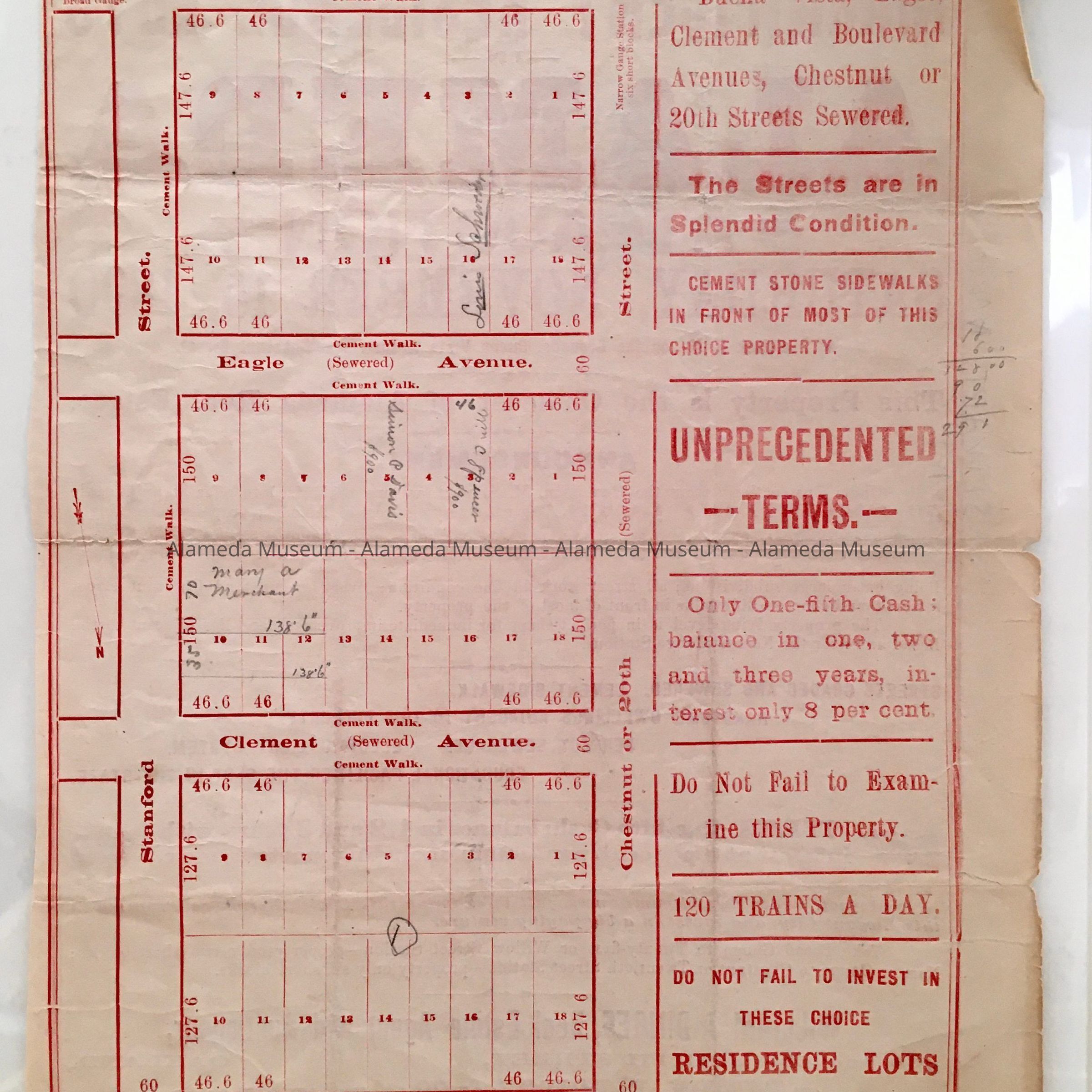 Real estate flyer for the auction of 50 residential lots to be held November 15, 1890. Property located between Stanford and Chestnut Streets, north of Buena Vista.