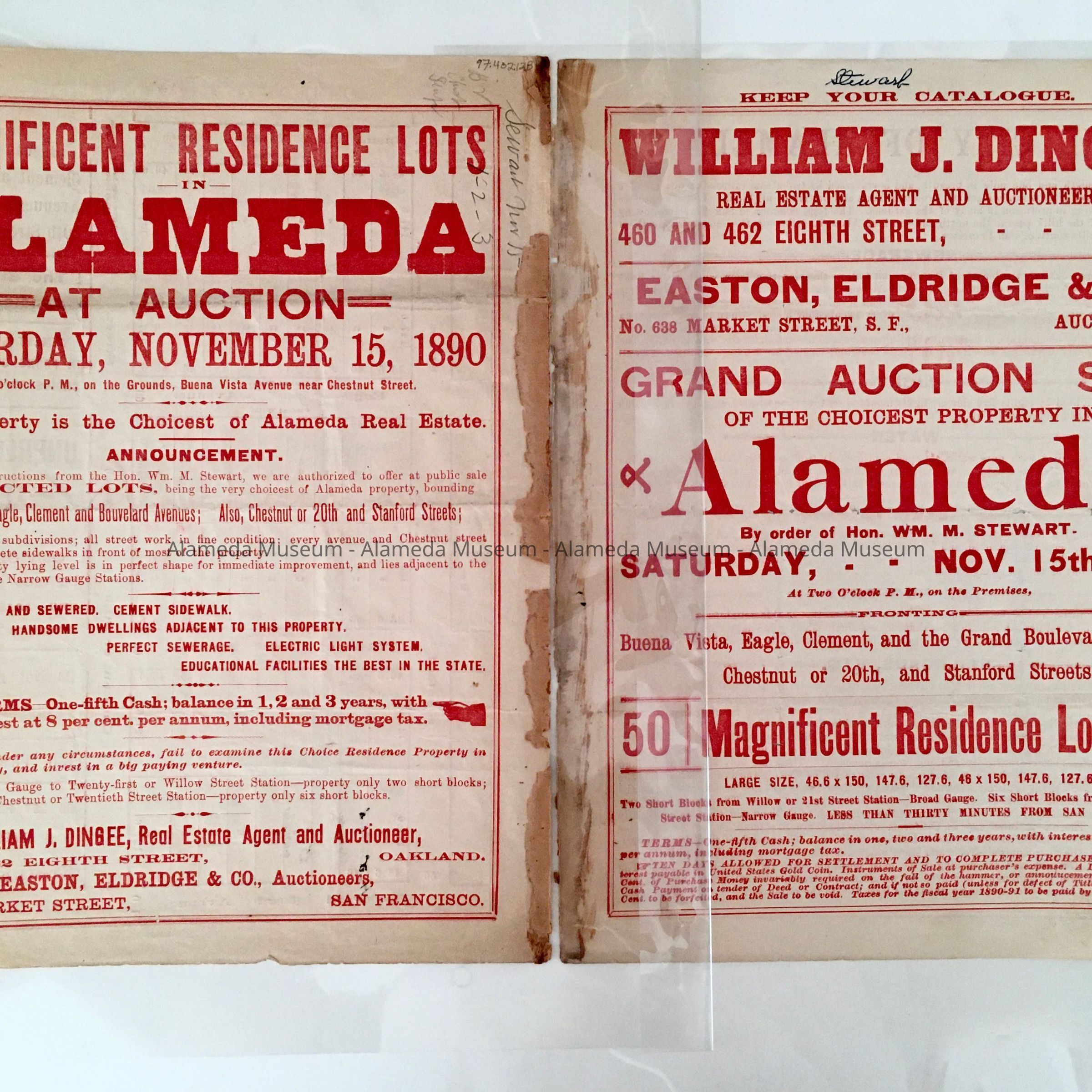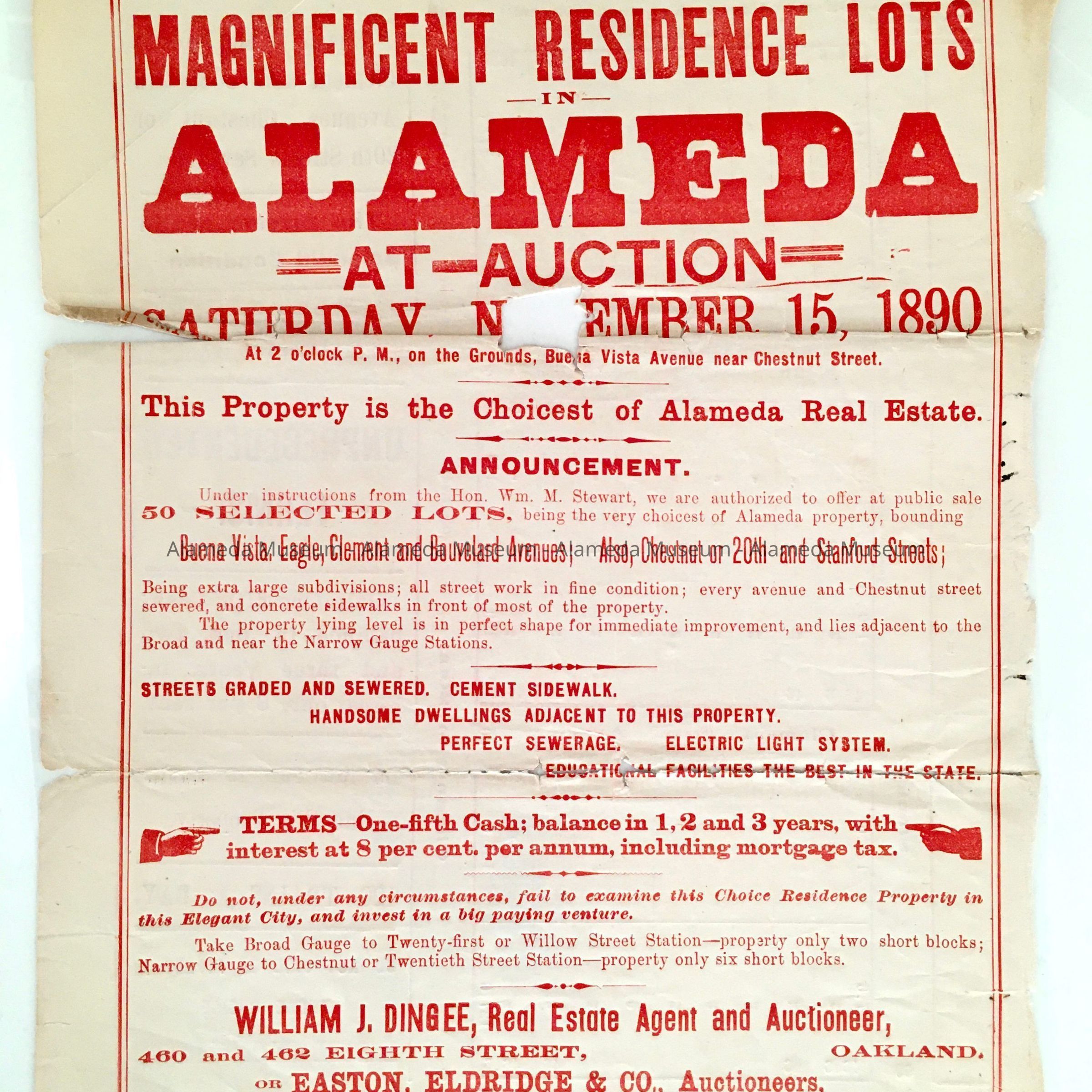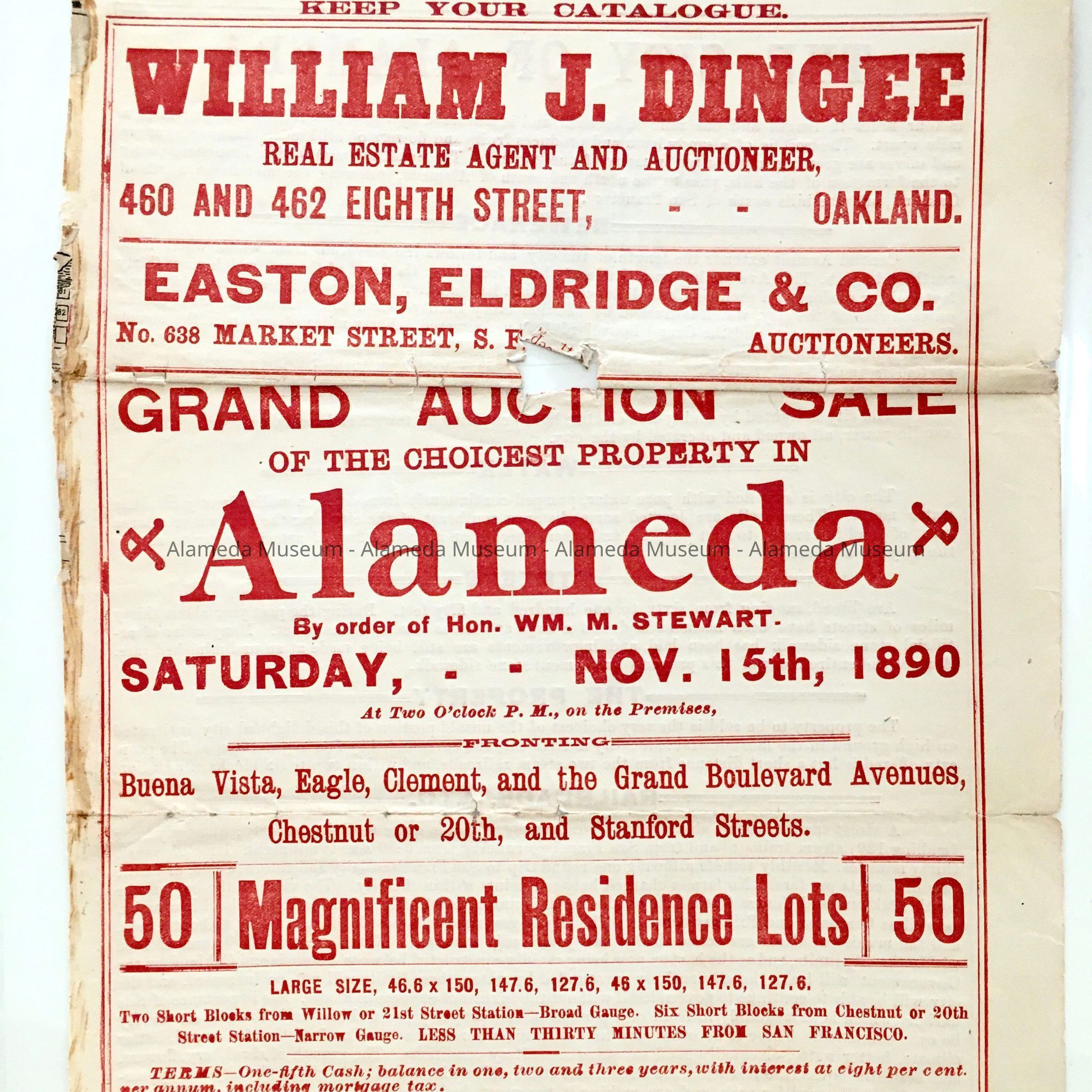 Real estate flyer issued by William J. Dingee for the sale of residential lots on November 15, 1890 located on Buena Vista, Eagle and Clement Avenues bordered by Stanford and Chestnut Streets.