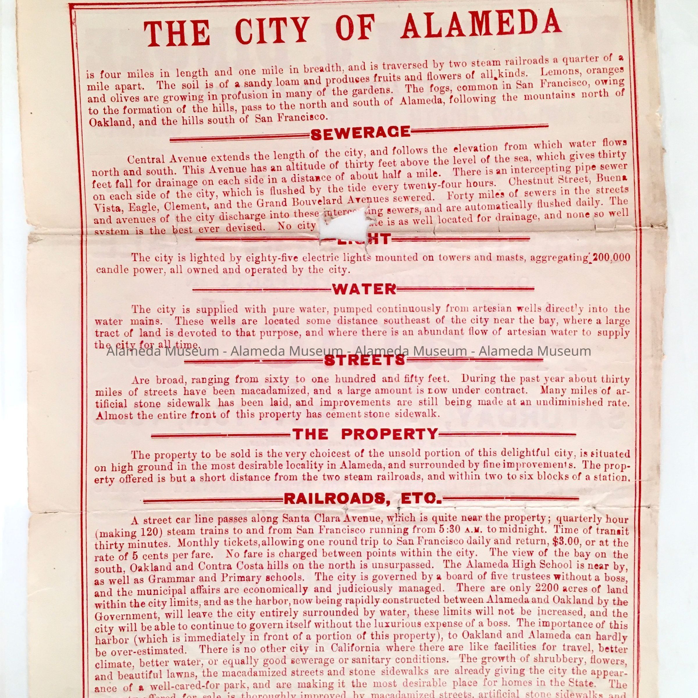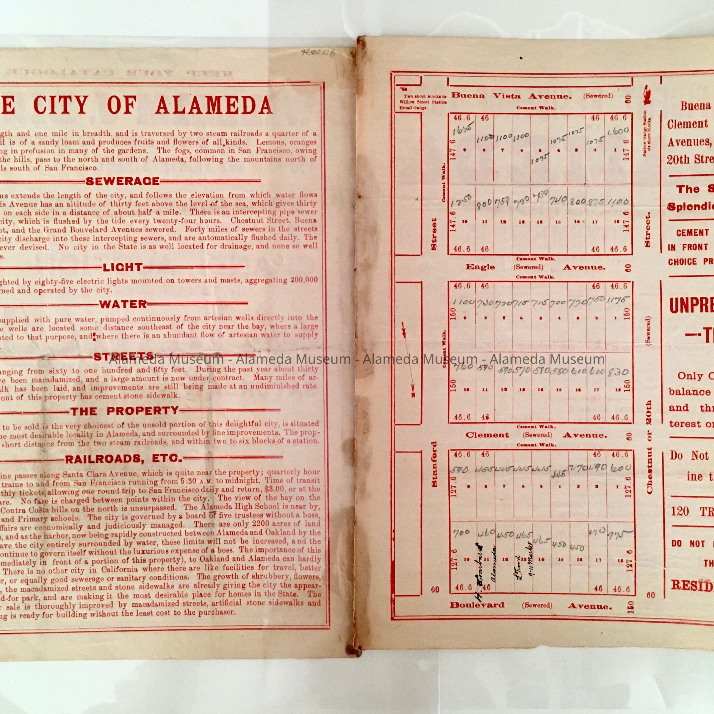 Two copies of 2-page flyer. Cover has bold-printed caption “Alameda” in red-colored type on an off-white colored background. Flyer in poor condition and now in 2 sections.