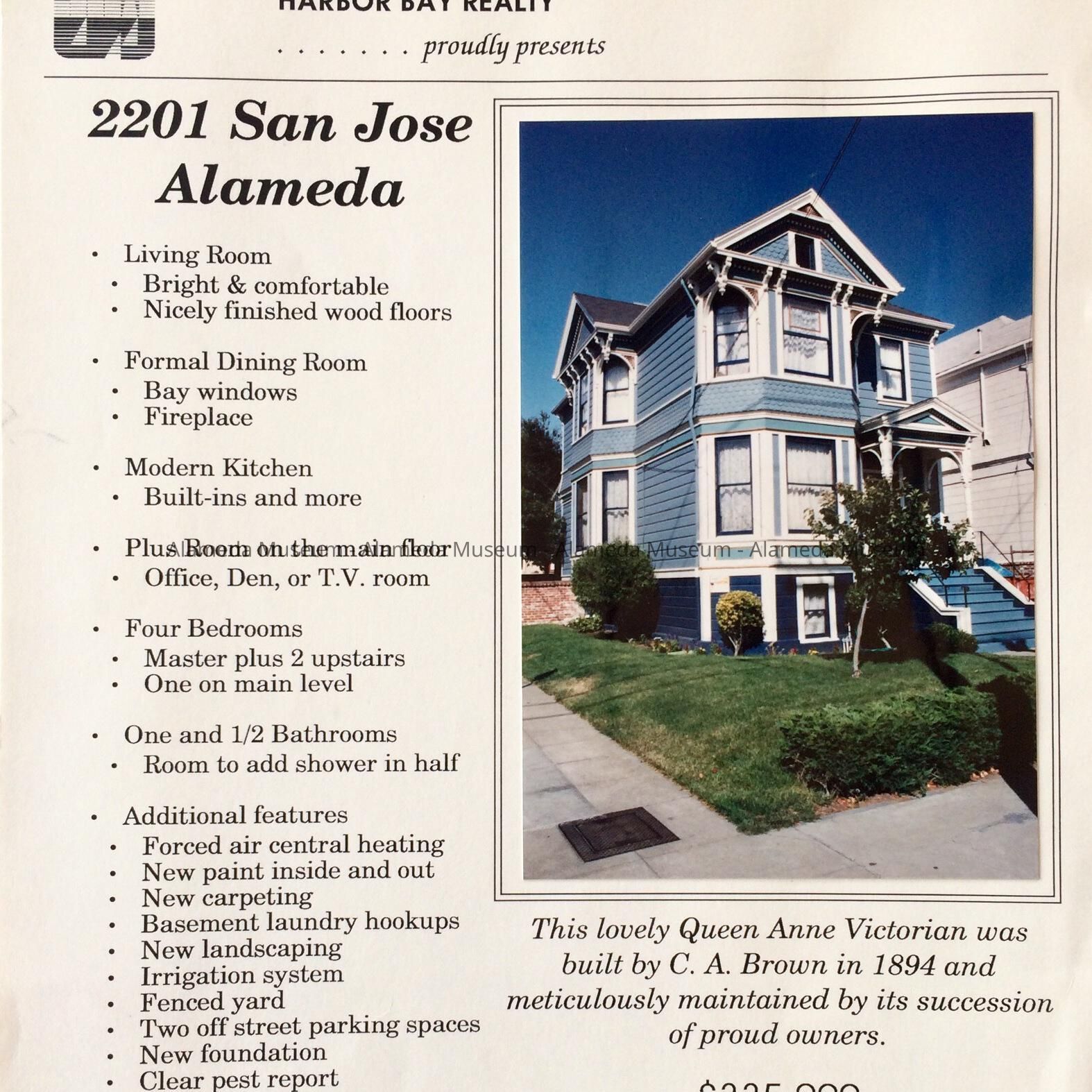 HISTORY OF OBJECT: AN ILLUSTRATED REAL ESTATE FLYER FOR THE SALE OF 2201 SAN JOSE AVENUE, ALAMEDA. THE FLYER INCLUDES A COLORED SNAPSHOT PHOTO OF THE MAIN FACADE OF THE QUEEN ANNE HOME WHICH WAS BUILT IN 1894.