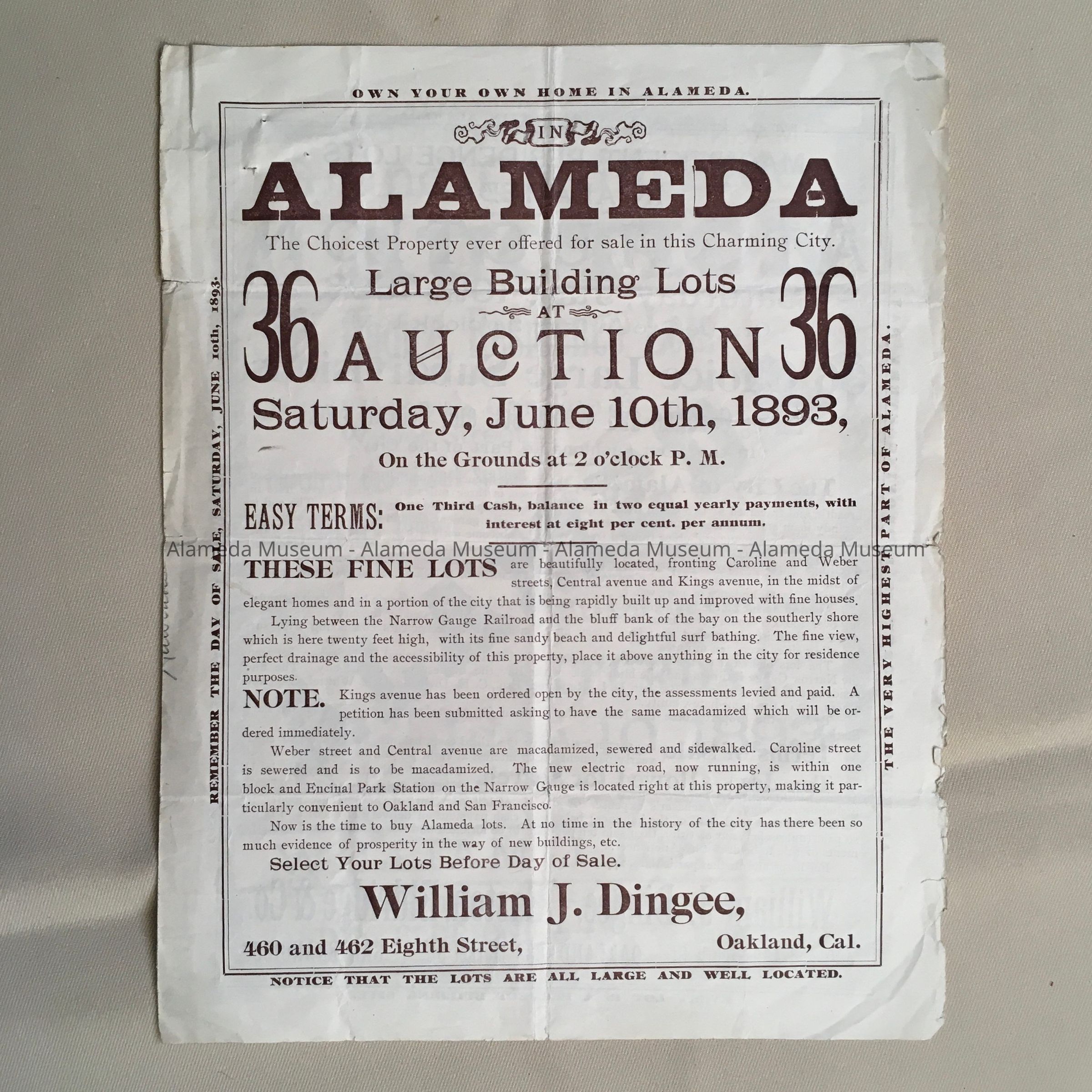 Flyer and note that were part of a folder, #510, found in the attic of City Hall. Real estate flyer for the public auction of 36 lots in Alameda offered by William J. Dingee, to be held June 10, 1893 of property on Weber and Caroline Streets, Kings Avenue (now known as San Antonio), Louisa Street (now known as Fair Oaks) and Central Avenue. The note proposes possible names for a train station in this neighborhood, 'Encinal', 'Encinal Park', 'Dwinelle', as there were plans to rename the station with the proposed naming of an 'Encinal Terminals' station.