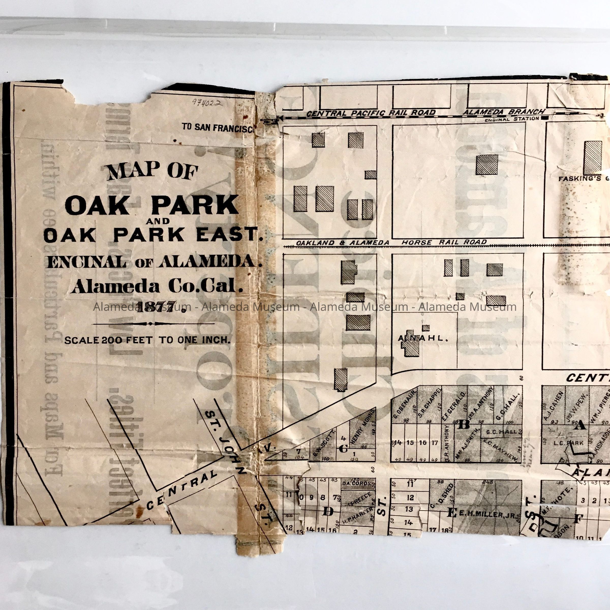 Real estate flyer including map of property in the Oak Park Tract, dated 1877, which includes property between Grand and Paru Streets, south of San Antonio Avenue.