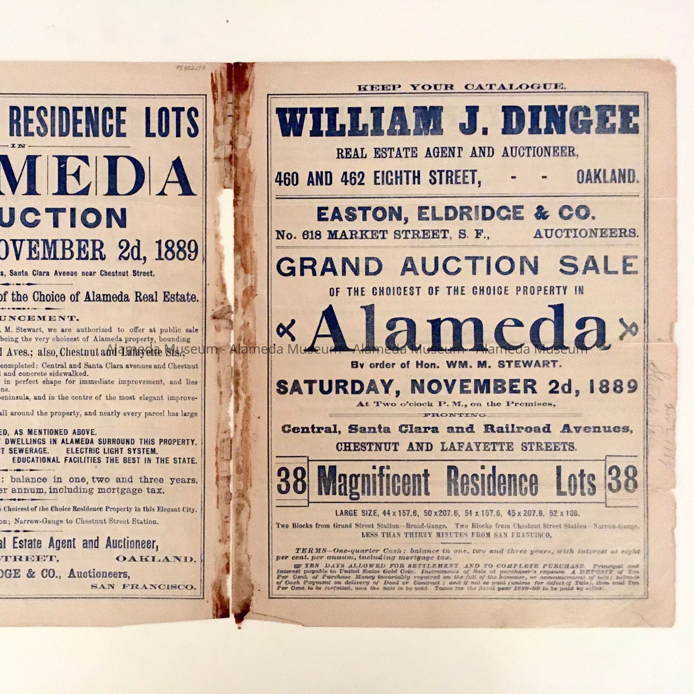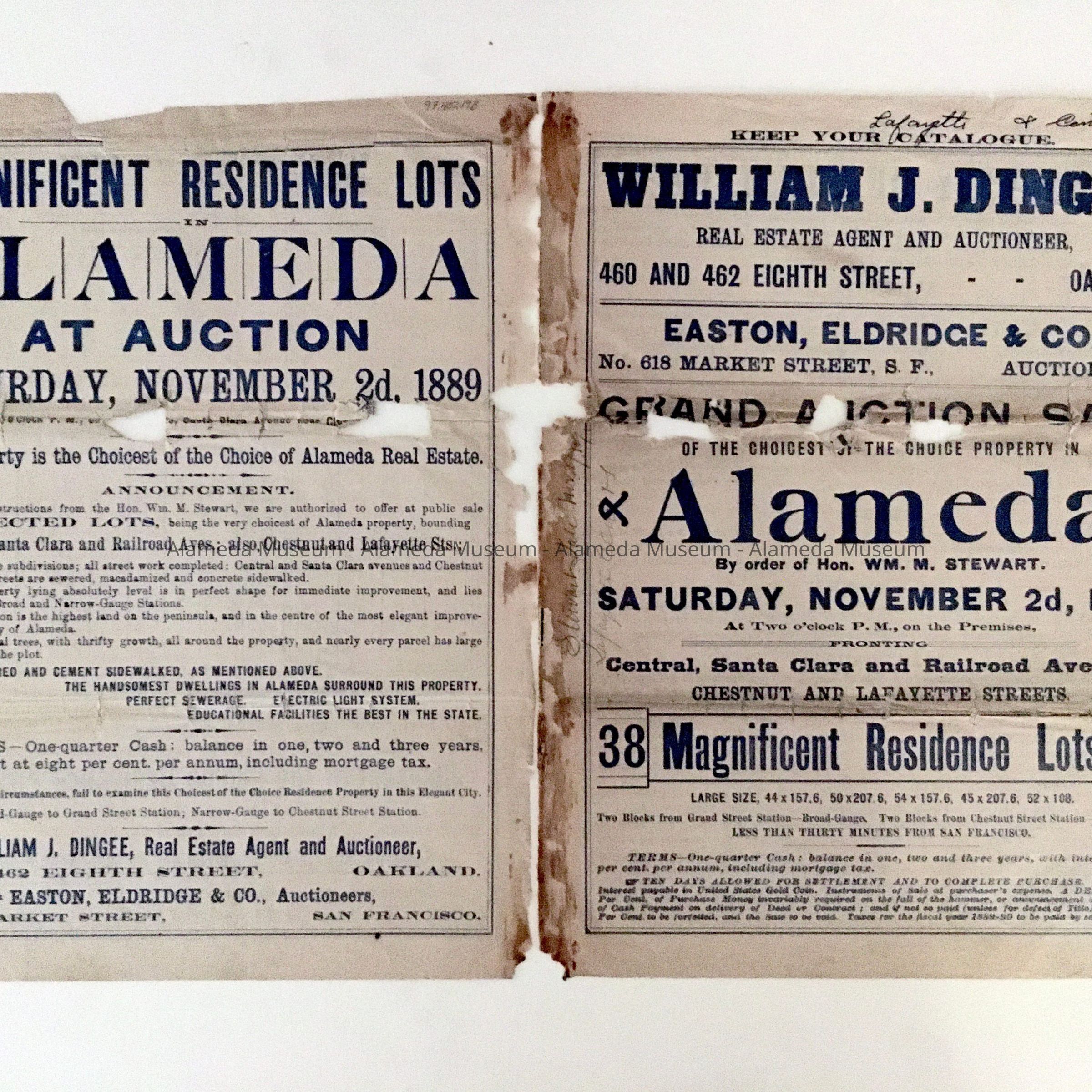 Real estate flyer for 38 residential lots to be sold by William J. Dingee, real estate agent and auctioneer. Property located at Lafayette, Chestnut Streets, and Central, Santa Clara, and Lincoln Avenues. Auction to be held November 2, 1889.