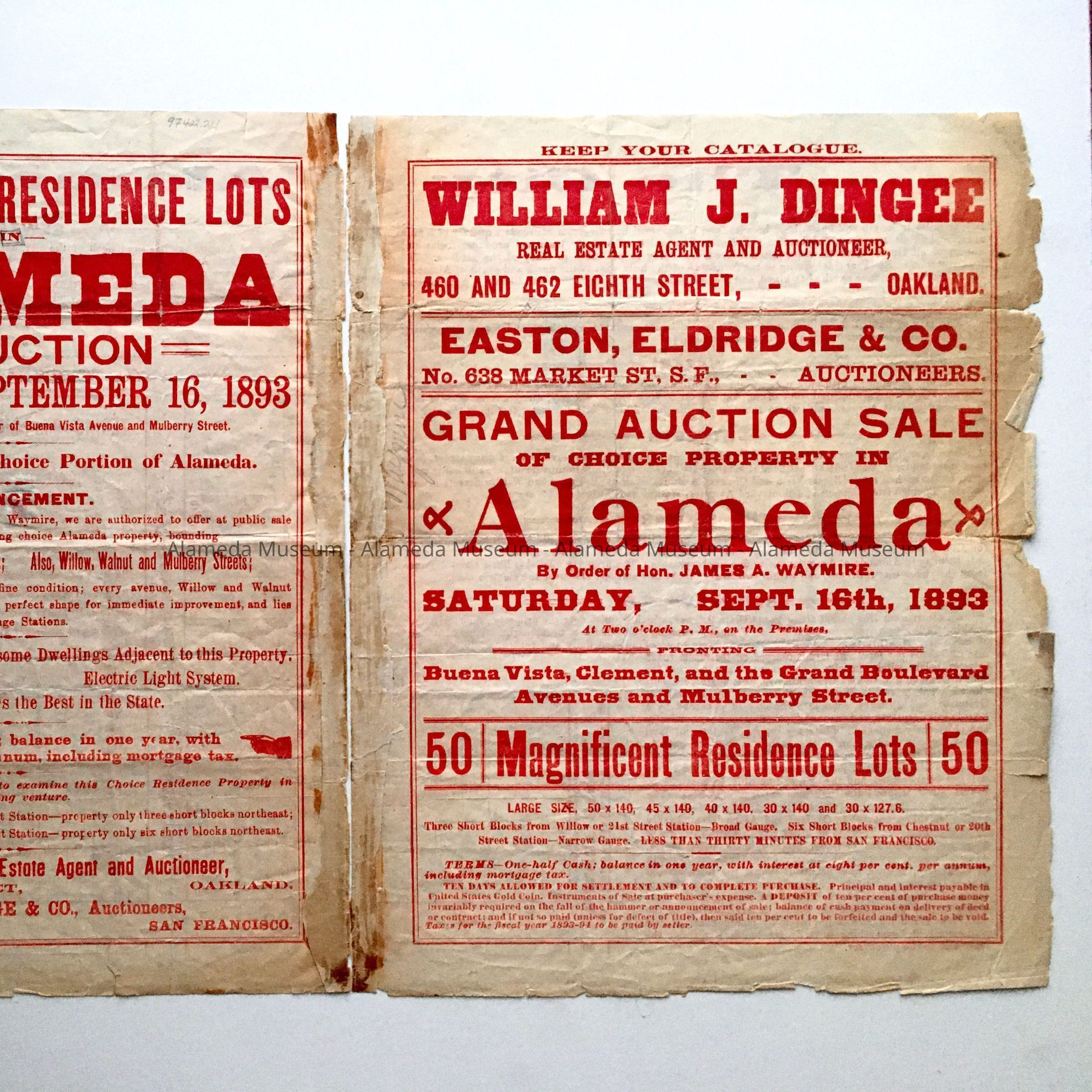Real estate flyer for the sale of property in Alameda offered September 16, 1893 of 50 residential lots on Clement and Buena Vista Avenues, Walnut, Mulberry and Willow Streets.