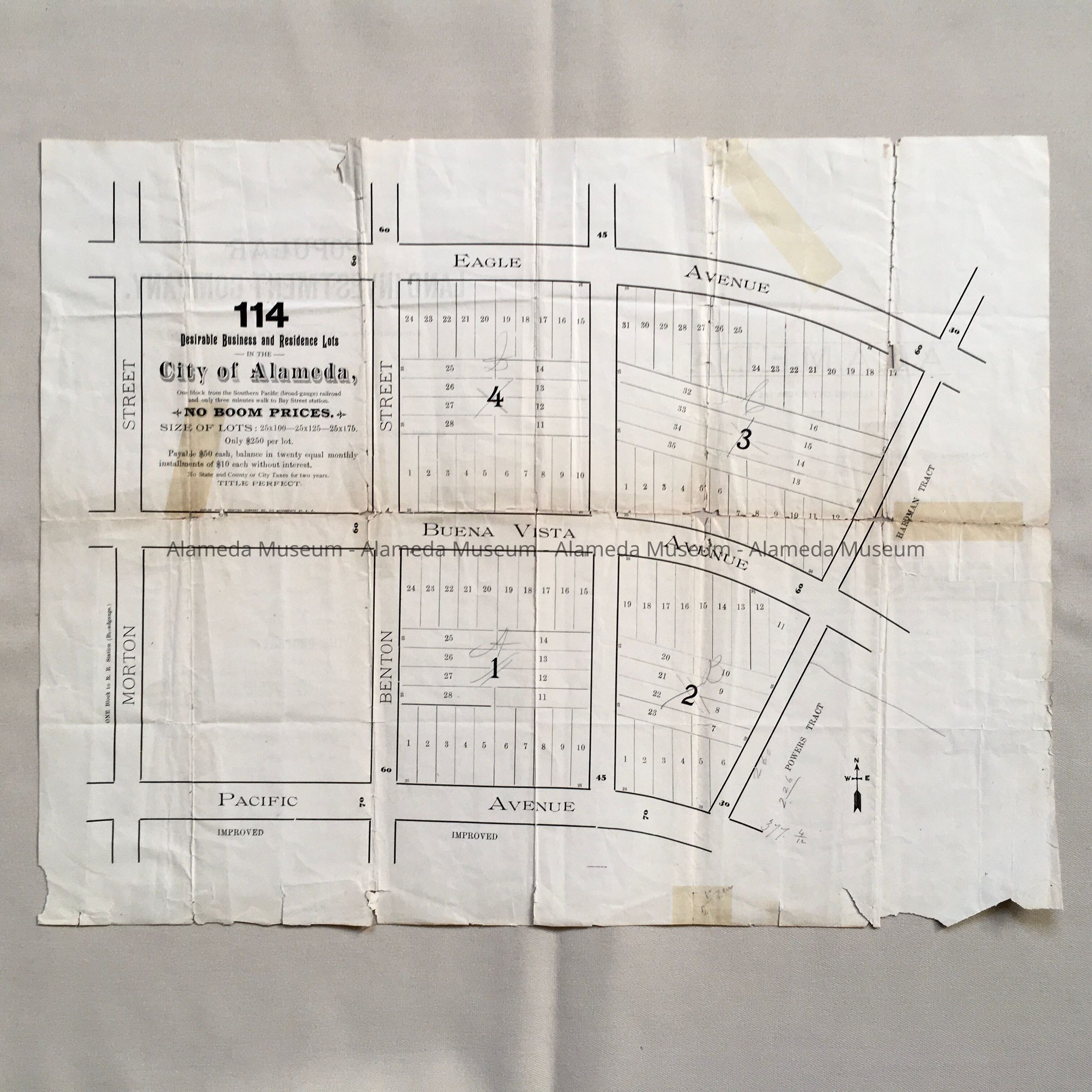 HISTORY OF OBJECT: A REAL ESTATE MAP OF THE FITCH TRACT, INCLUDING PROPERTY BOUNDED BY BENTON STREET, PACIFIC AND EAGLE AVENUES. THE MAP IS FROM THE ORIGINAL ALAMEDA MUSEUM COLLECTION PRIOR TO 1971 AND NOT CATALOGED UNTIL 2015.