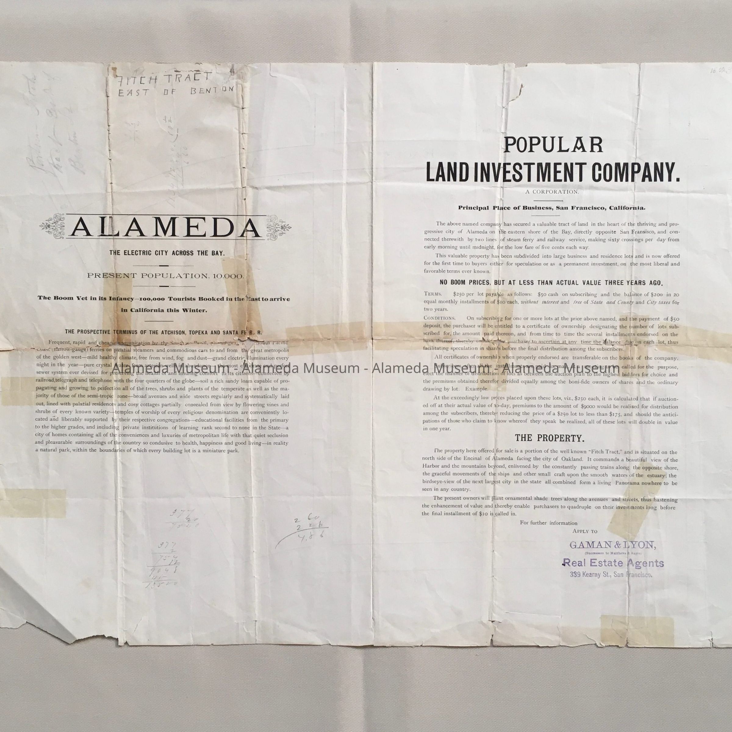 DESCRIPTION: A FOLDED MAP THAT WAS ORIGINALLY A BUSINESS FLIER. ITS CAPTION STATES, "114 DESIRABLE AND RESIDENCE LOTS, CITY OF ALAMEDA." ALSO INCLUDED IS A DESCRIPTION OF THE LAND AND TRANSPORTATION SYSTEM, ETC.