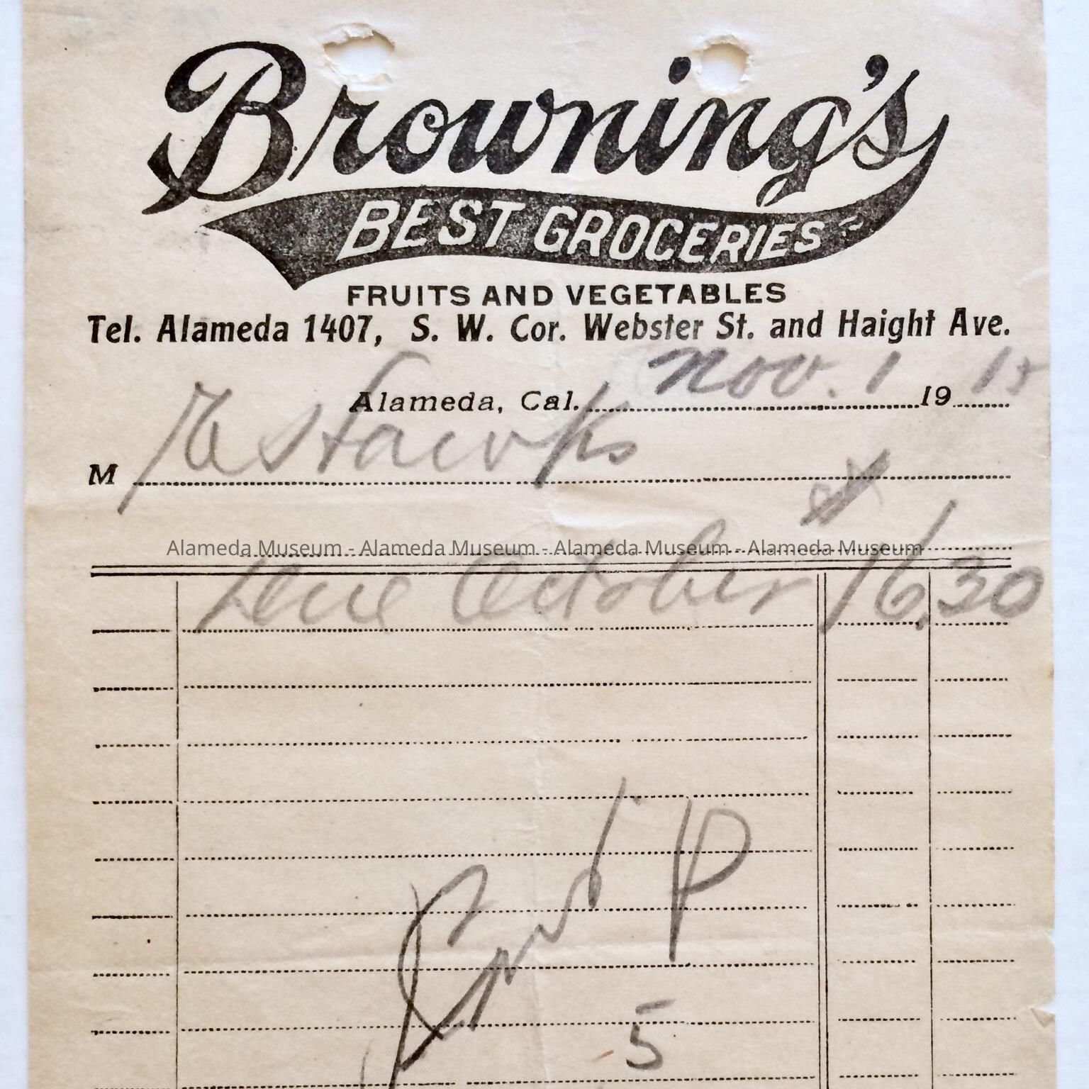 HISTORY OF OBJECT: RECEIPT FOR GROCERIES PURCHASED BY H. HAWKS, 1529 6TH STREET, ALAMEDA, FROM BROWNING'S BEST GROCERIES, FRUITS AND VEGETABLES, s. W. COR. WEBSTER ST. AND HAIGHT AVE.