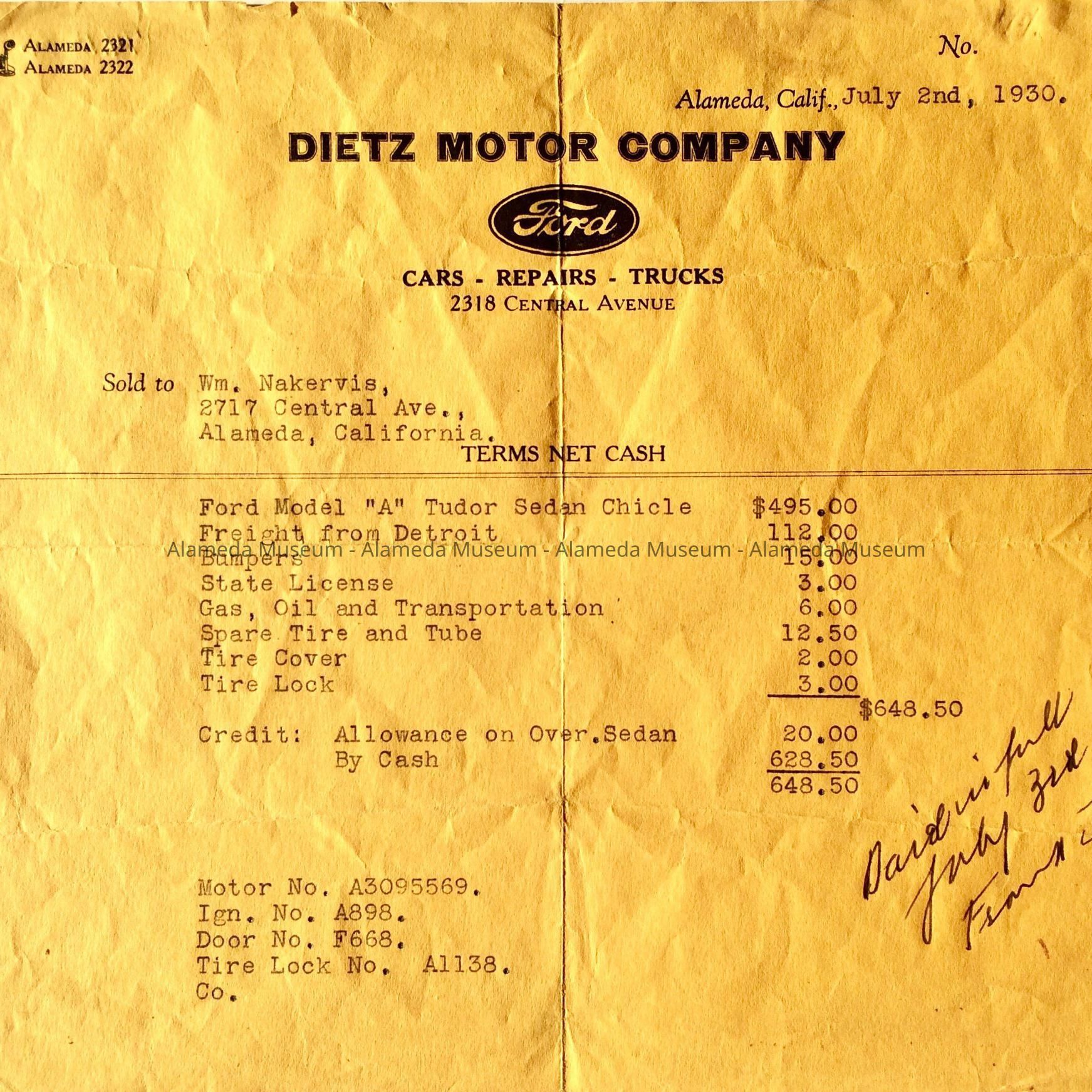 Receipt Dietz Motor Company, Alameda, Ford Model A, 1930Entry/Object ID