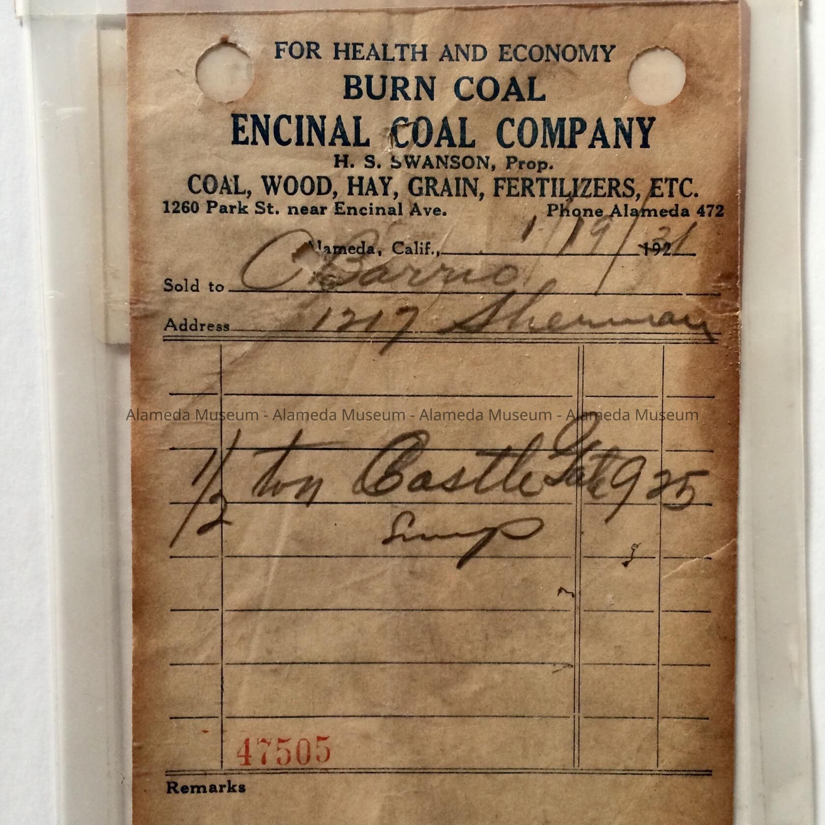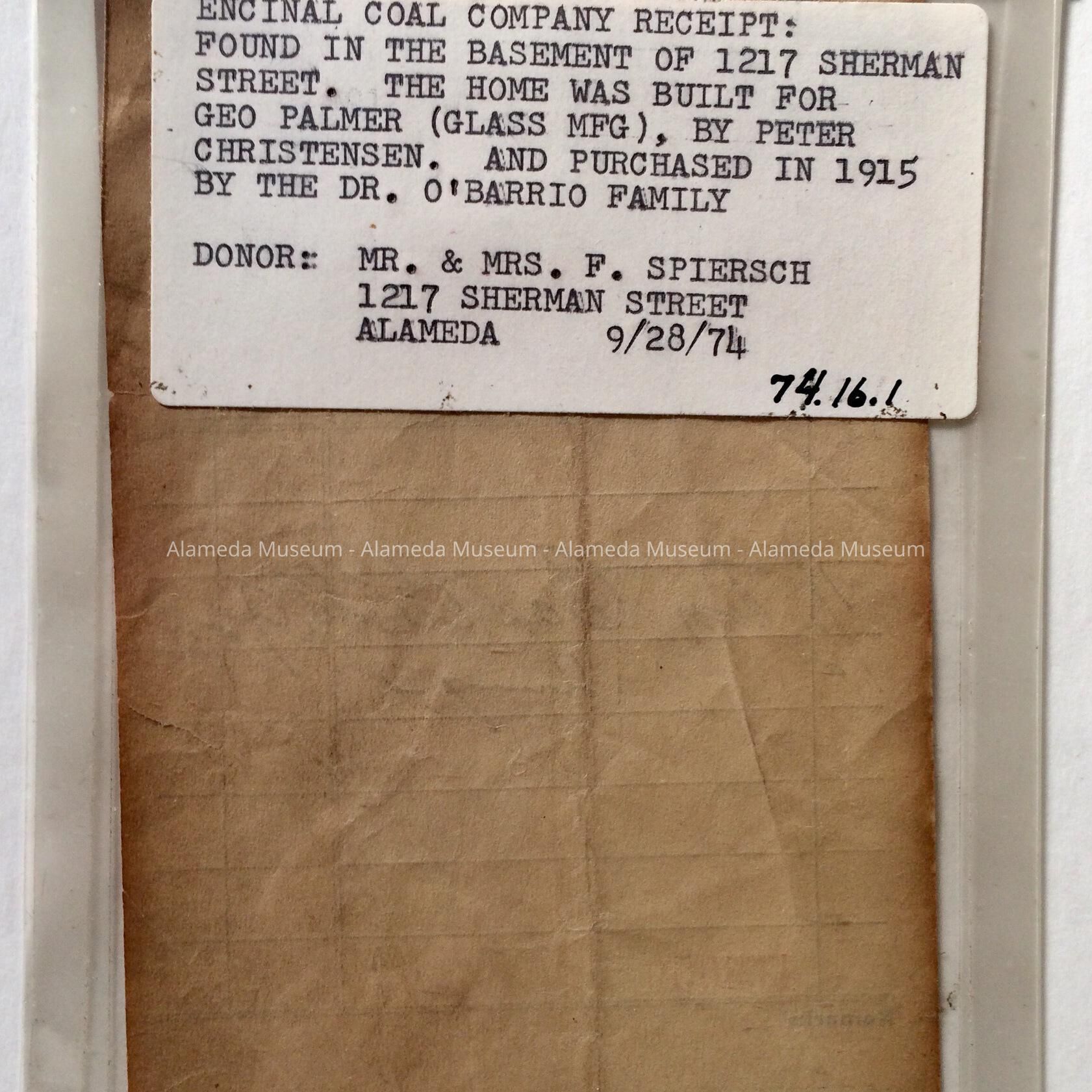 HISTORY: ENCINAL COAL COMPANY RECEIPT: FOUND IN THE BASEMENT OF 1217 SHERMAN STREET. THE HOME WAS BUILT FOR GEO PALMER (GLASS MFG), BY PETER CHRISTENSEN. AND PURCHASED IN 1915 BY THE DR. O'BARRIO FAMILY.