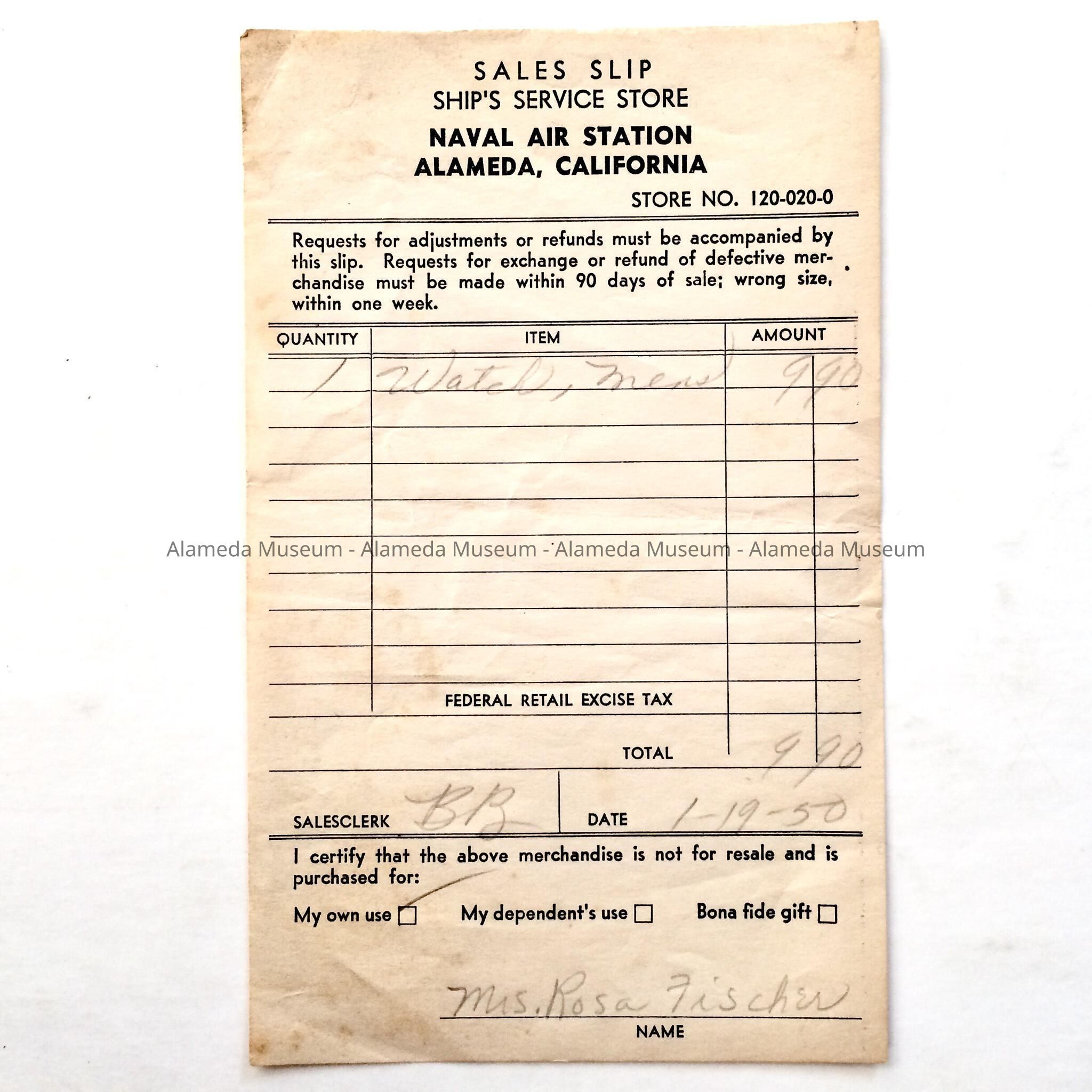 HISTORY OF OBJECT: A RECEIPT FOR A WATCH PURCHASED AT THE NAVAL AIR STATION'S SHIPS SERVICE STORE, DATED JANUARY 1950.