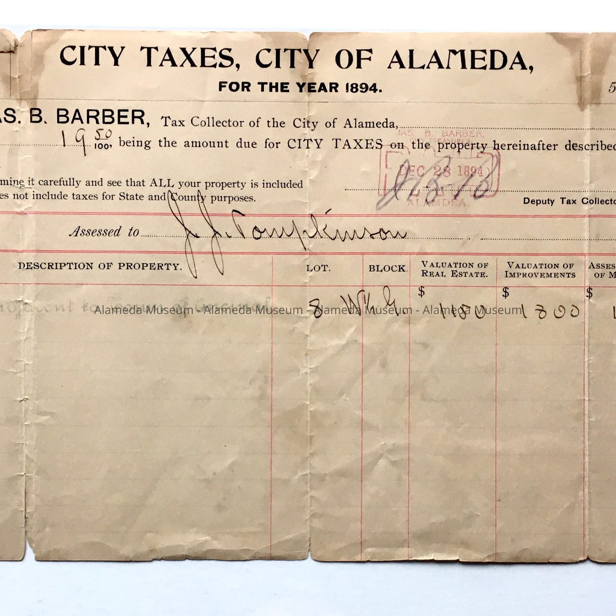 HISTORY OF OBJECT: RECEIPT FOR CITY TAXES, CITY OF ALAMEDA, FOR THE YEAR 1894, ASSESSED TO J J TOMPKINSON FOR PROPERTY KNOWN AS 2029 SAN ANTONIO AVENUE, ALAMEDA, CALIFORNIA.