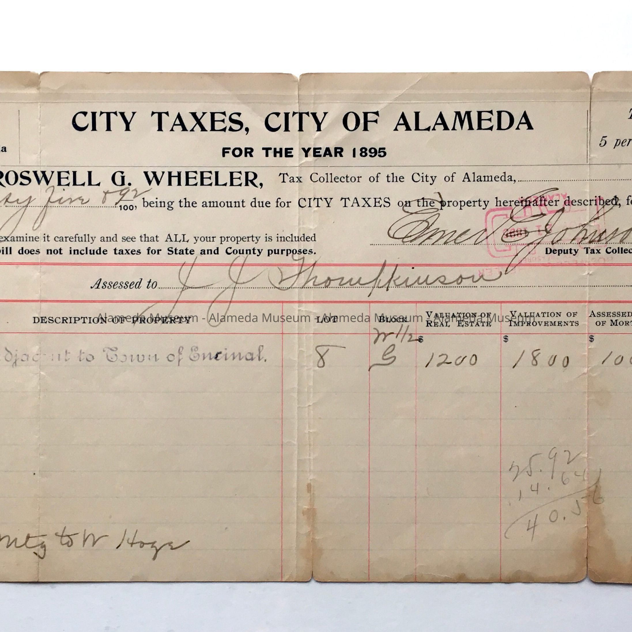 HISTORY OF OBJECT: RECEIPT FOR CITY TAXES, CITY OF ALAMEDA, FOR THE YEAR 1895, FOR PROPERTY ASSESSED TO MR J J TOMPKINSON, FOR PROPERTY KNOWN AS 2029 SAN ANTONIO AVENUE, ALAMEDA, CALIFORNIA.