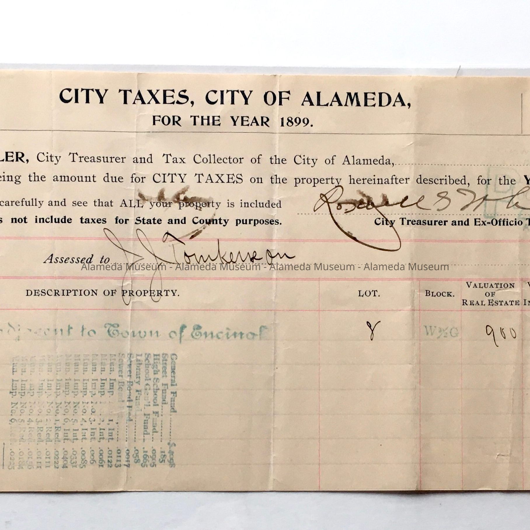 HISTORY OF OBJECT: RECEIPT FOR CITY TAXES, CITY OF ALAMEDA, DATED 1899, AND ASSESSED TO J J TOMPKINSON FOR PROPERTY KNOWN AS 2029 SAN ANTONIO AVENUE, ALAMEDA, CALIFORNIA.