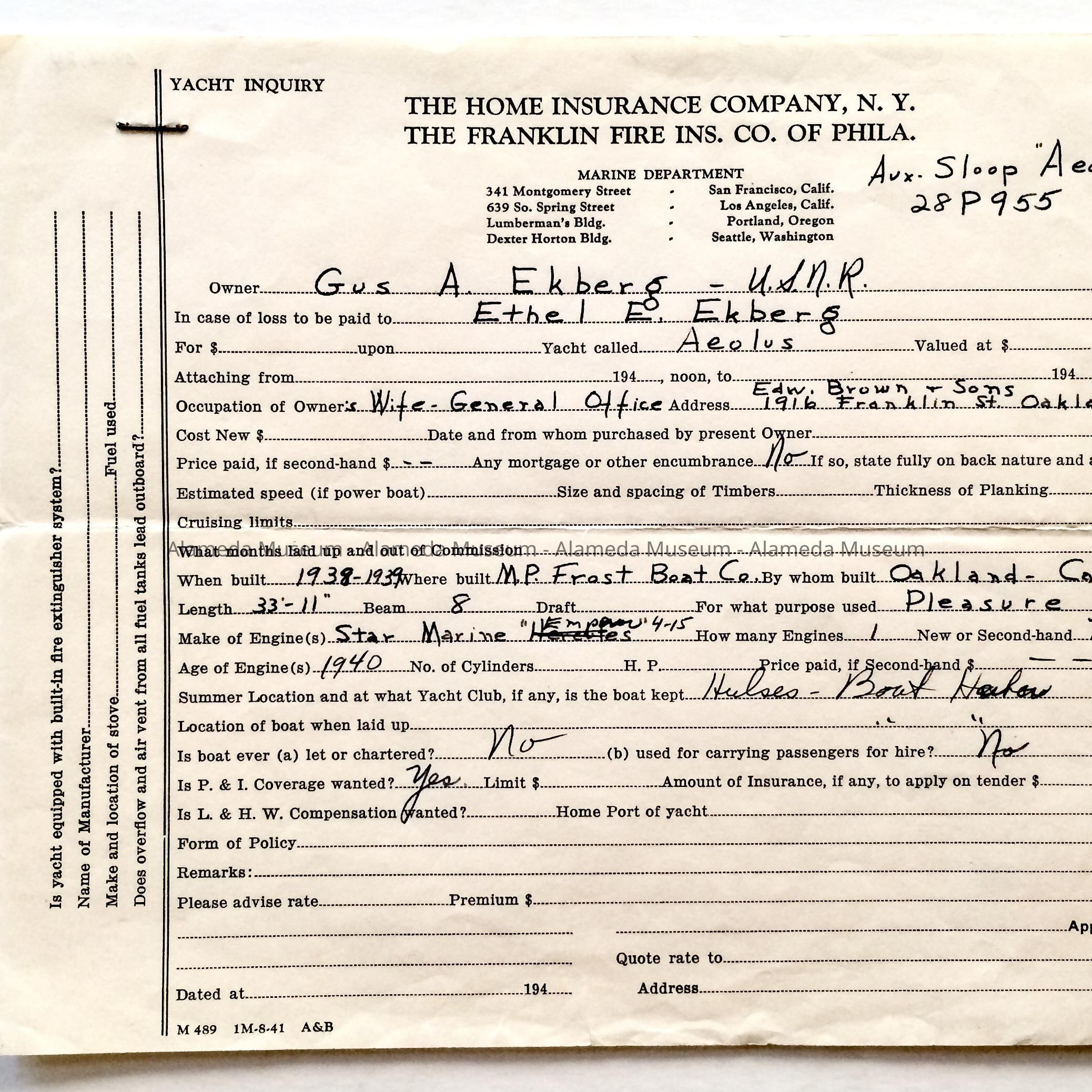 History of Object: A RECEIPT FOR INSURANCE TAKEN OUT ON THE YACHT AEOLUS OWNED BY GUS AND ETHEL EKBERG. MR. EKBERG WAS A PROMINENT MEMBER OF THE AEOLIAN YACHT CLUB.