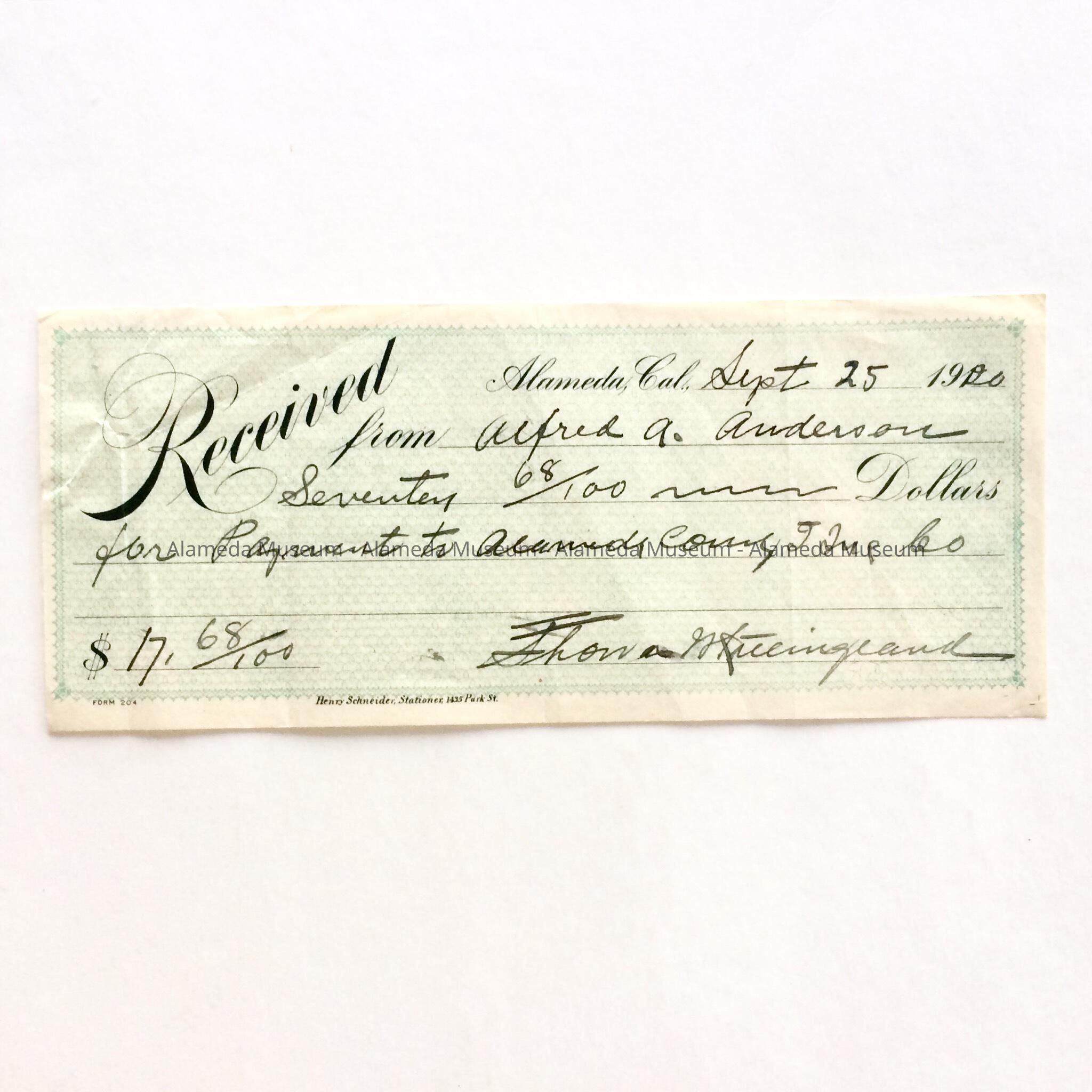History of Object: Receipt made out to Alfred A. Anderson from Thomas W. Killingland (Bay Station Realty Co.) for payment of $17.68 to the Alameda County Insurance Company, dated Sept. 25, 1920. Insurance for 1614 Bay Street, which had been recently purchased by Mr. Anderson.