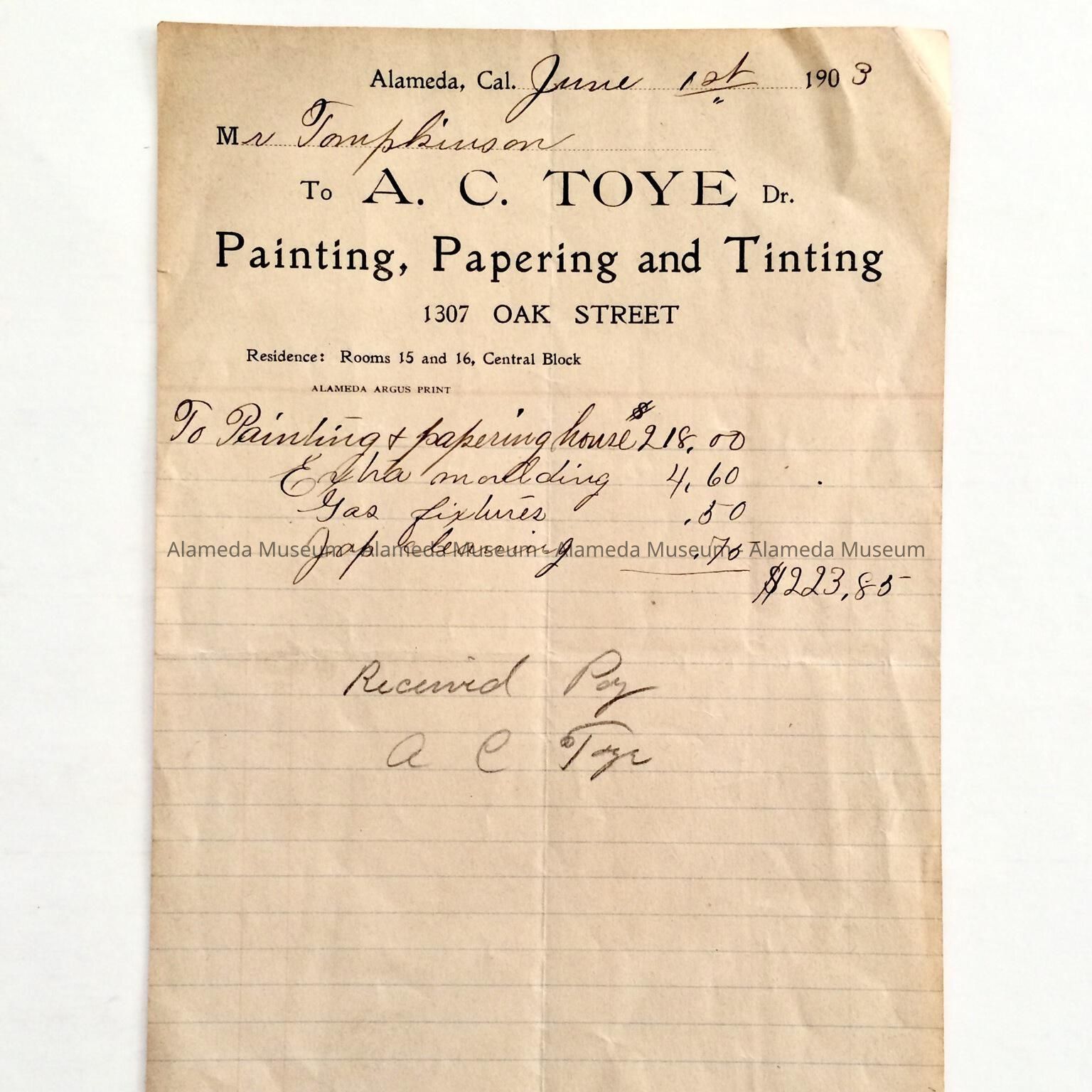 Receipt for labor issued by A.C. Toye for painting, etc. dated June 1, 1903. The customer was a Mr. Thompkinson. Given prior to 1971 and never catalogued.