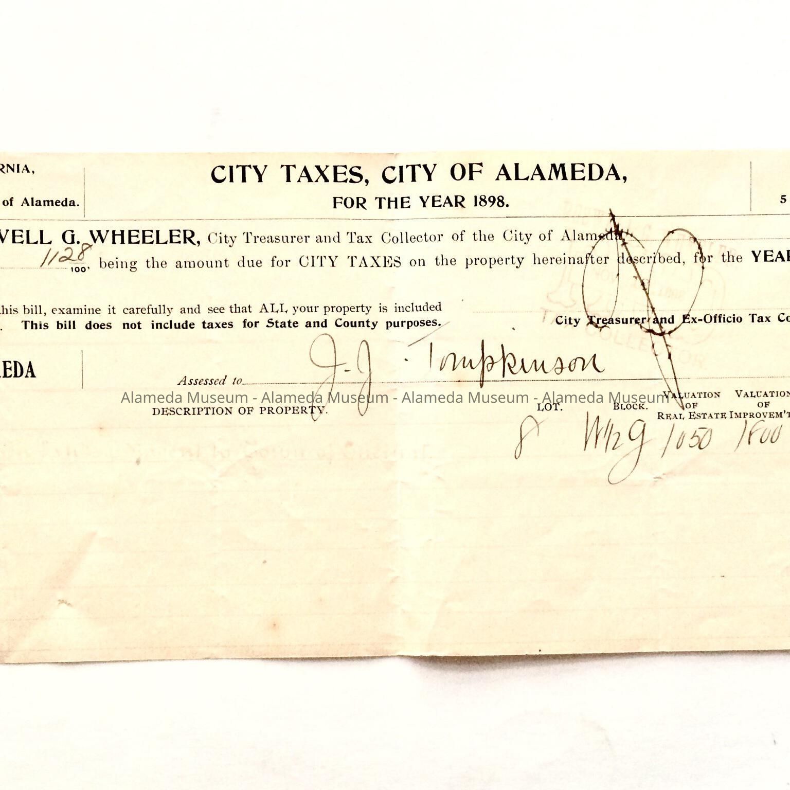 Receipt for payment of property taxes assessed to J.J. Tompkinson. Dated Nov. 18, 1898. Given to the Alameda Historical Society prior to 1971 and never catalogued.