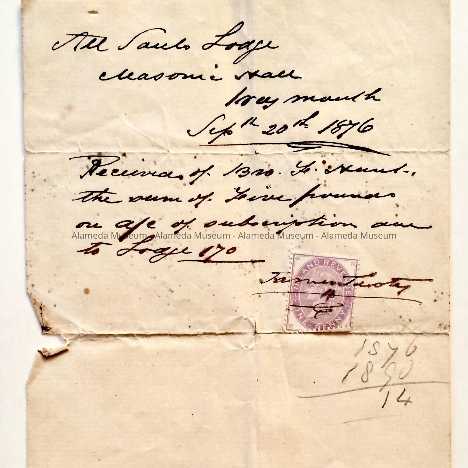 Receipt for payment of dues for All Souls Lodge, Weymouth, England, of F. Hunt, 1876Entry/Object ID