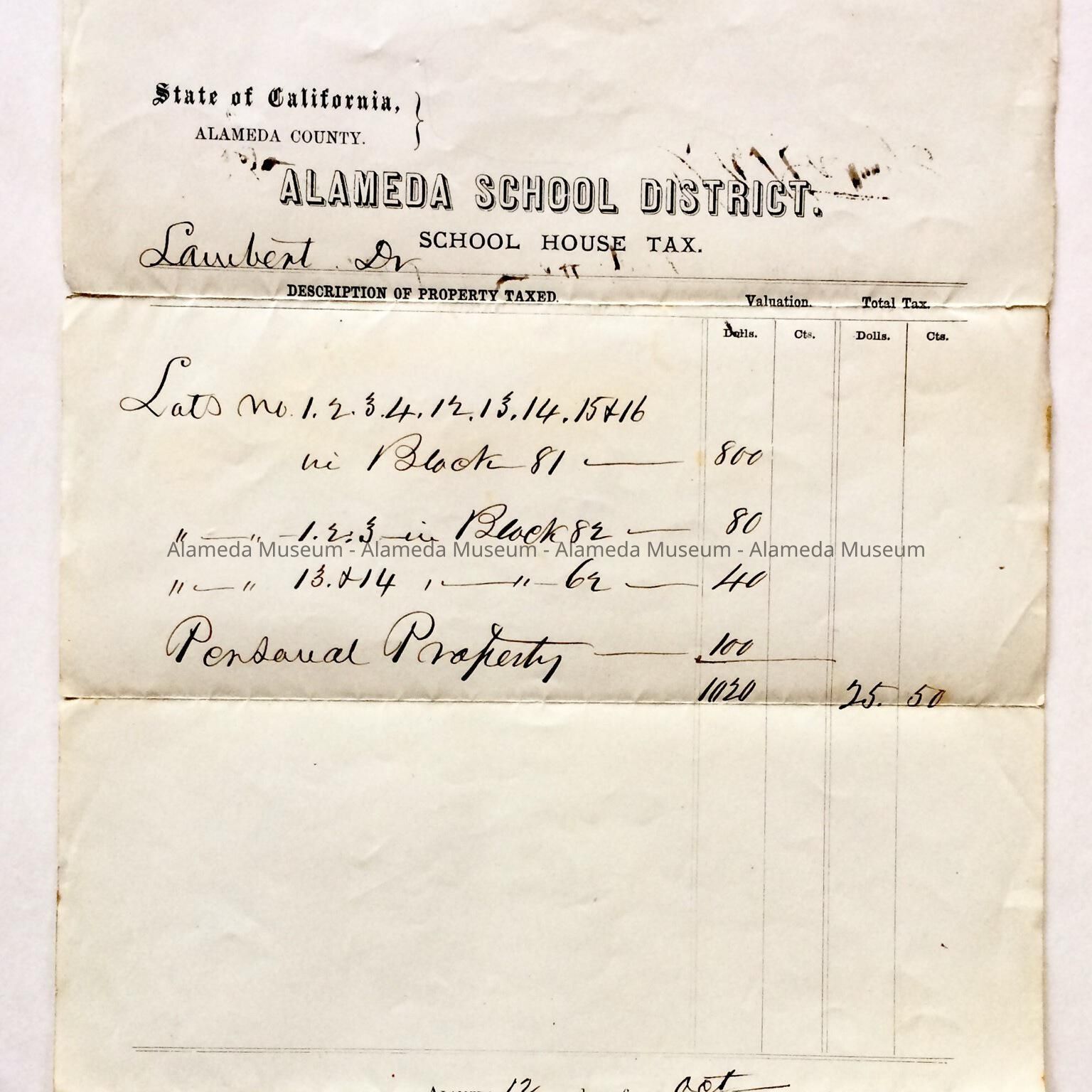 Receipt for payment of the Alameda School District School House Tax. The revenue was created by a tax on property which is described on the form. The property in question was owned by the pioneer physician, Dr. Lambert, and located on Fountain Street between Encinal and Jackson Streets, northwest corner of High and Encinal, northwest corner of Encinal and Fountain Street and the southeast corner of High and Madison. This item was given to the Alameda Historical Society in 1959 and never catalogued.