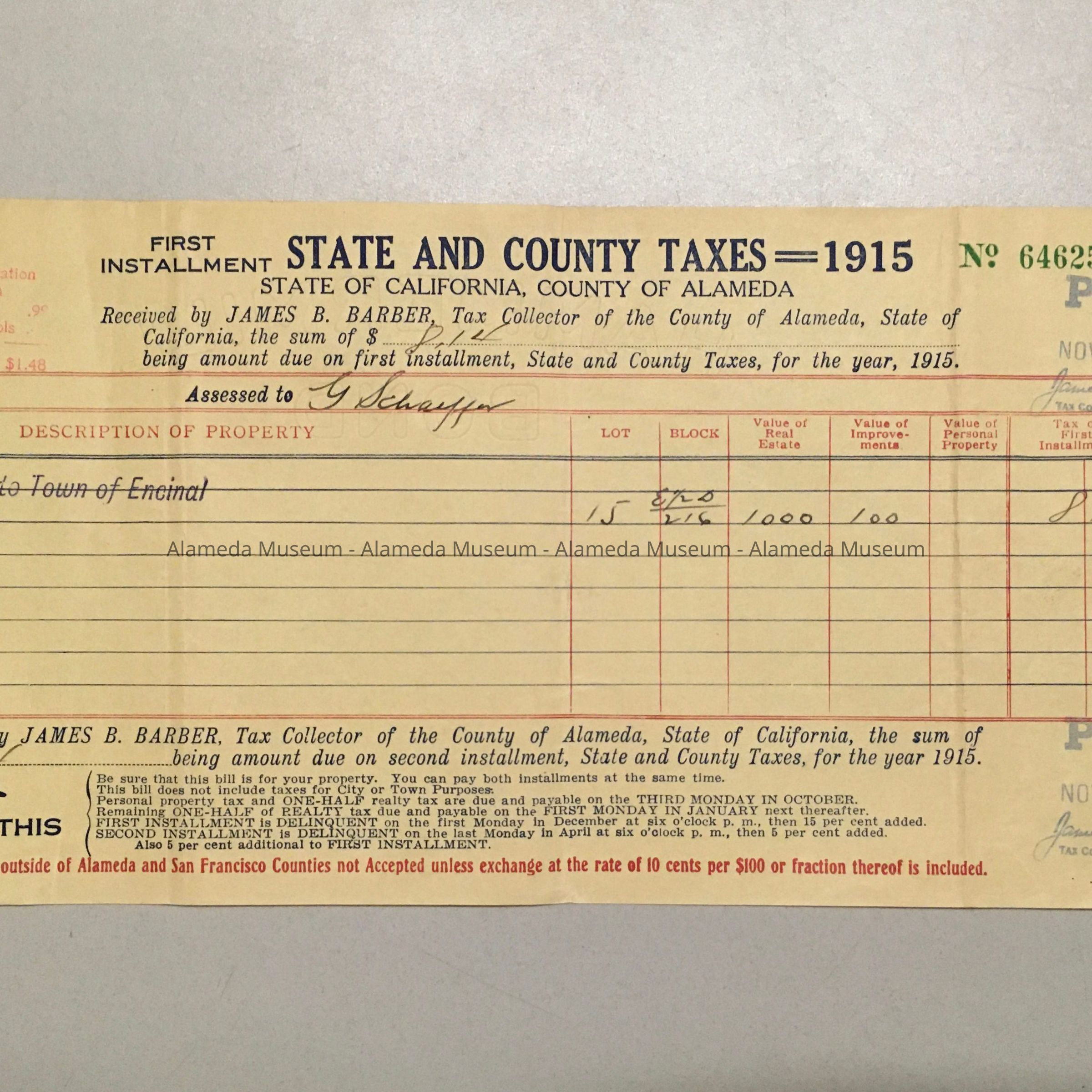 HISTORY OF OBJECT: RECEIPT FOR PAYMENT OF STATE AND COUNTY TAXES FOR 1915, ASSESSED TO GEORGE SCHAEFFER, FOR PROPERTY IN LANDS ADJACENT TO THE TOWN OF ENCINAL, LOT #15.