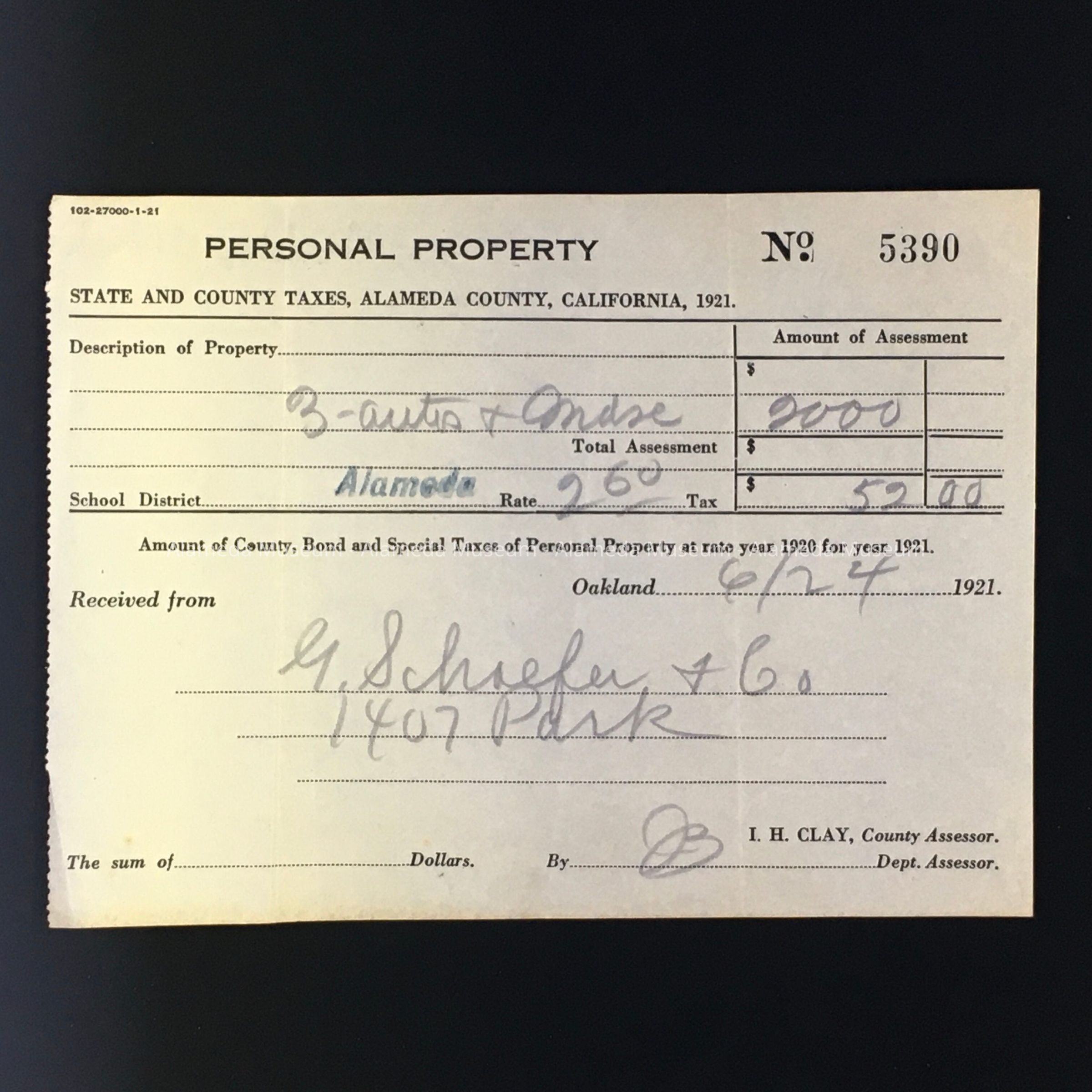 HISTORY OF OBJECT: RECEIPT OF PAYMENT FOR PERSONAL PROPERTY FOR STATE AND COUNTY TAXES, INCLUDING THREE AUTOMOBILES AND MERCHANDISE FOR THE GEORGE SCHAEFFER & CO. STORE AT 1407 PARK STREET, ALAMEDA.