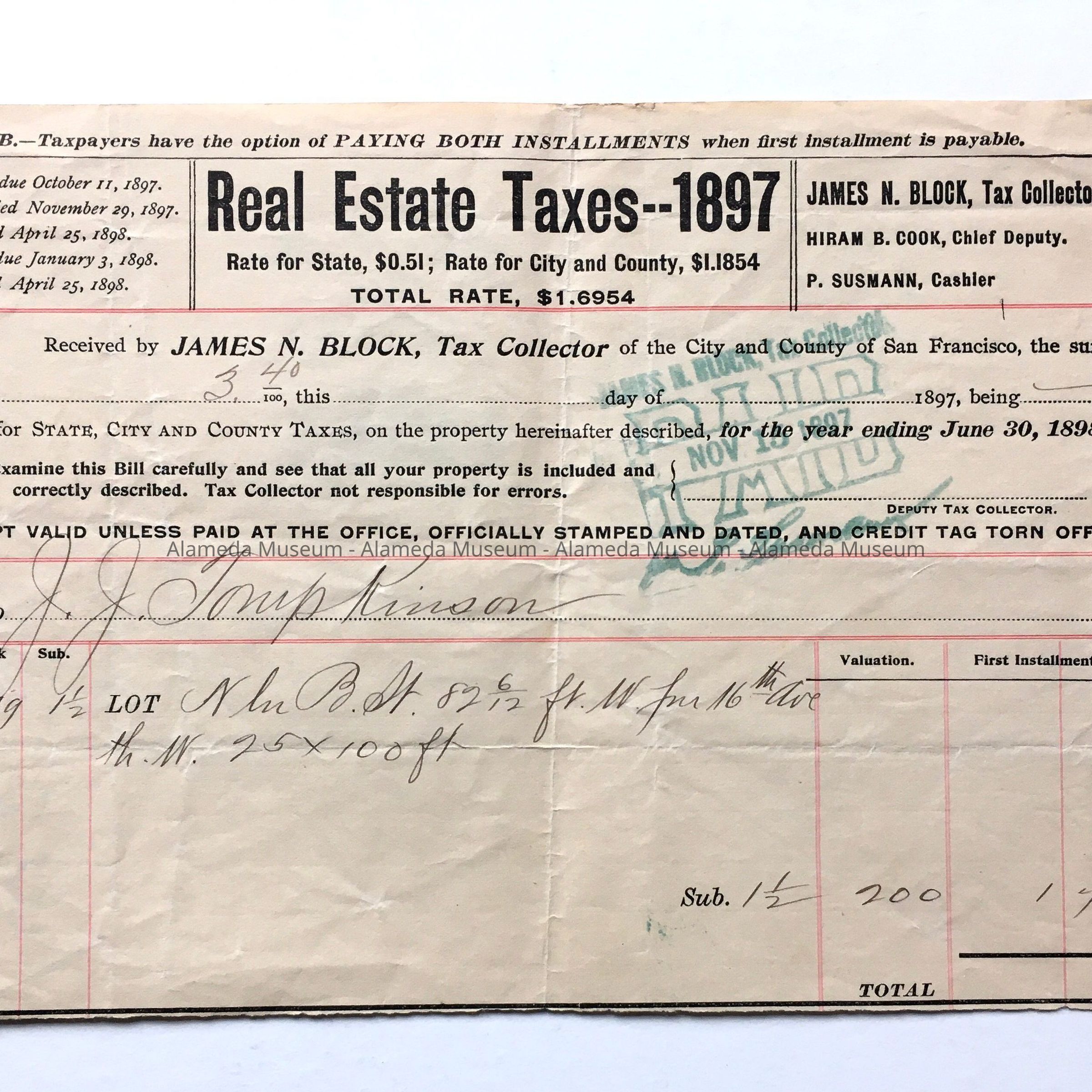 RECEIPT FOR REAL ESTATE TAXES (PAYMENT) FOR 1897. ISSUED TO J J TOMPKINSON FOR PROPERTY KNOWN AS 2029 SAN ANTONIO AVENUE, ALAMEDA, CALIFORNIA. CITY AND COUNTY TAXES.