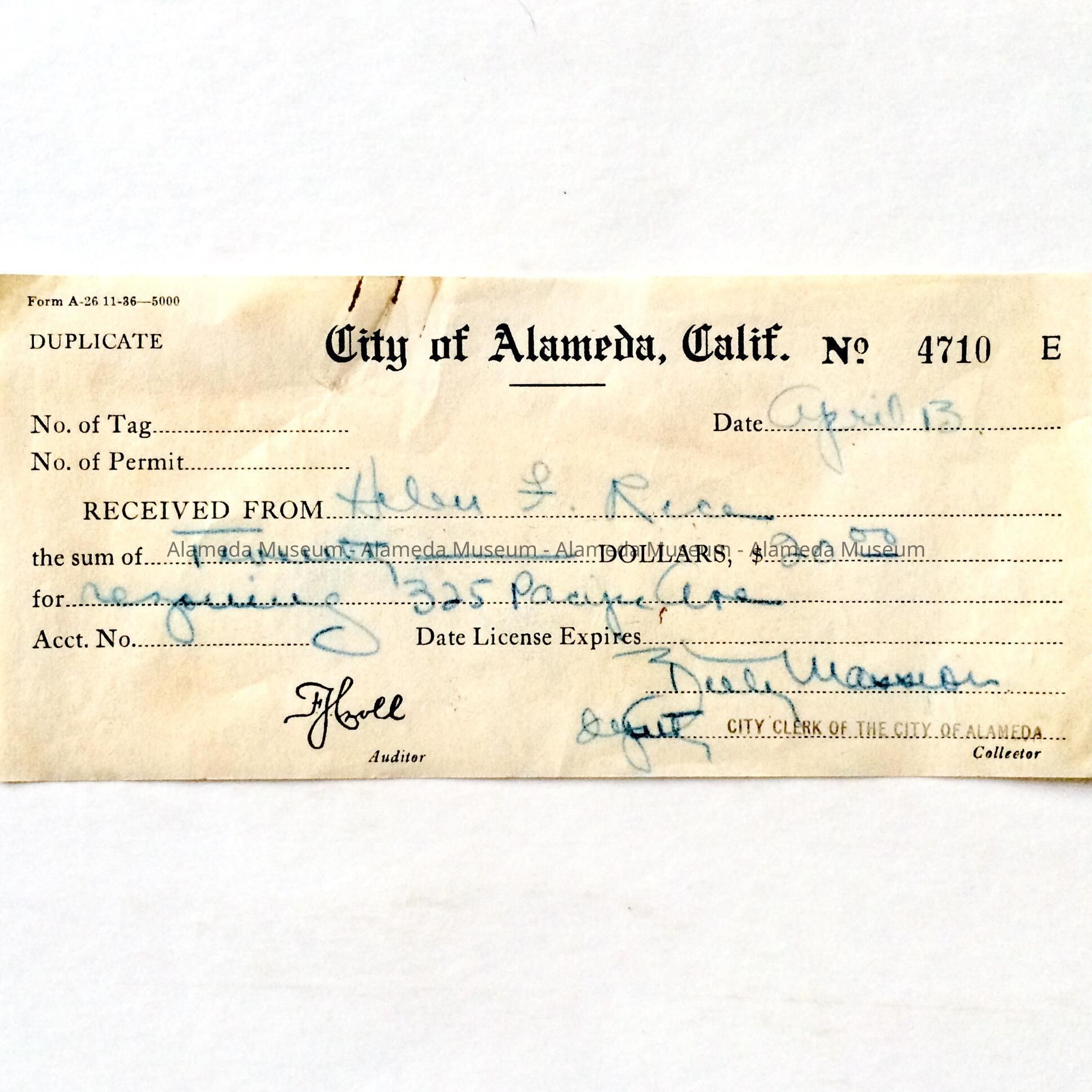HISTORY OF OBJECT: A RECEIPT ISSUED BY THE CITY OF ALAMEDA'S CITY CLERK TO HELEN F. RICE FOR THE REZONING OF 325 PACIFIC AVENUE. MR. RICE WAS THE EXECUTRIX OF THE PROPERTY.