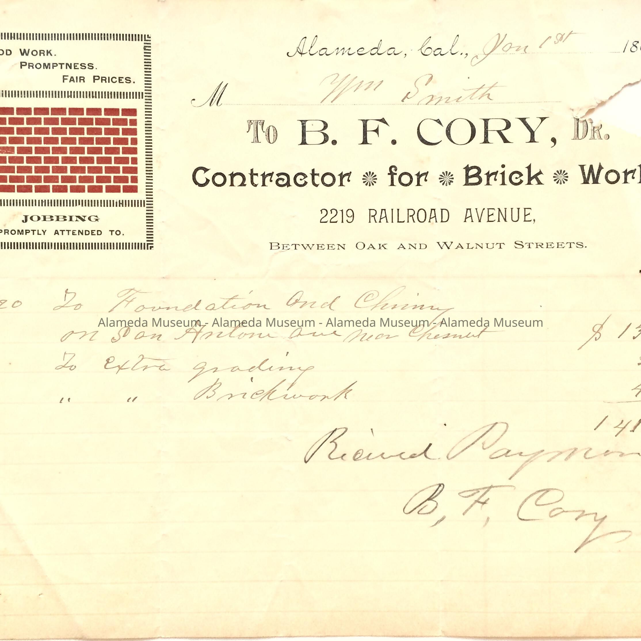 Receipt for services by B. F. Cory, Brick Contractor, 1894Entry/Object ID