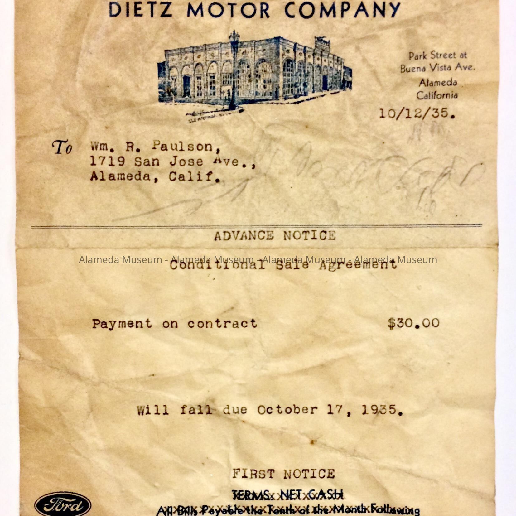 HISTORY OF OBJECT: A RECEIPT FOR SERVICES FROM THE DIETZ MOTOR CO., BUENA VISTA AVENUE AND PARK STREET, DATED OCT. 12, 1935. RECEIPT WAS ISSUED TO WILLIAM R. PAULSON, 1719 SAN JOSE AVENUE, ALAMEDA.