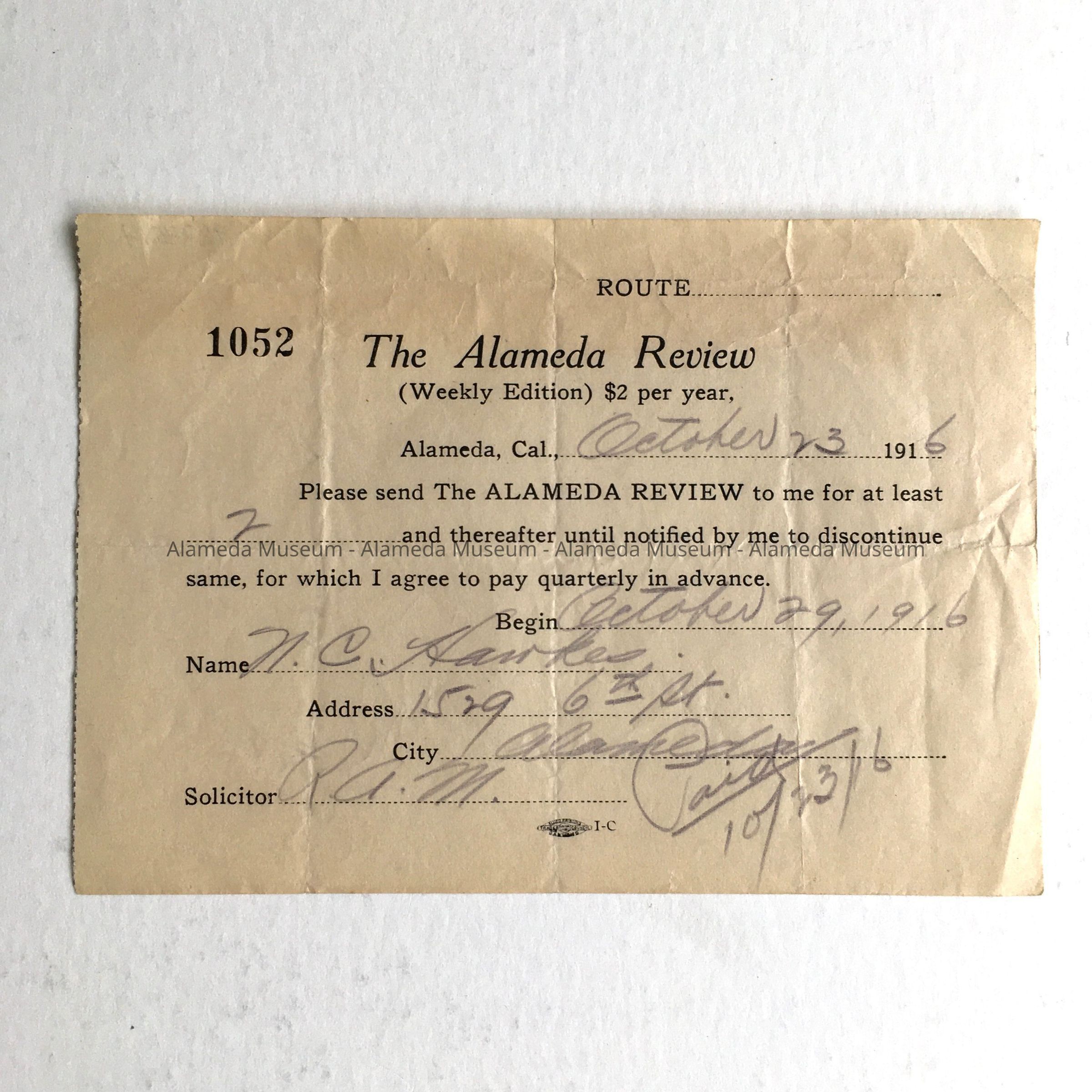 Receipt for the Alameda Review, Weekly Edition, 1916Entry/Object ID