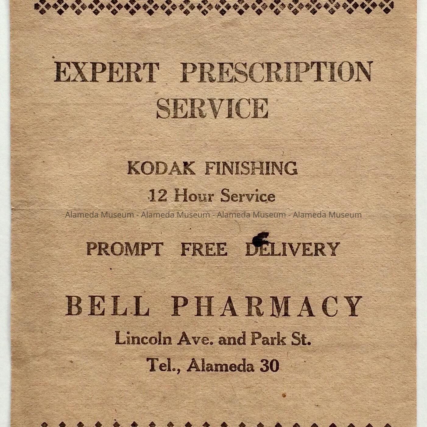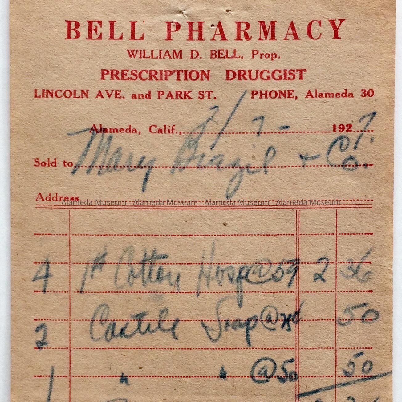 RECEIPT FORM, "BELL PHARMACY, WILLIAM D BELL, PROPRIETOR, LINCOLN AND PARK STREET, ALAMEDA," DATED FEBRUARY 7, 1927.