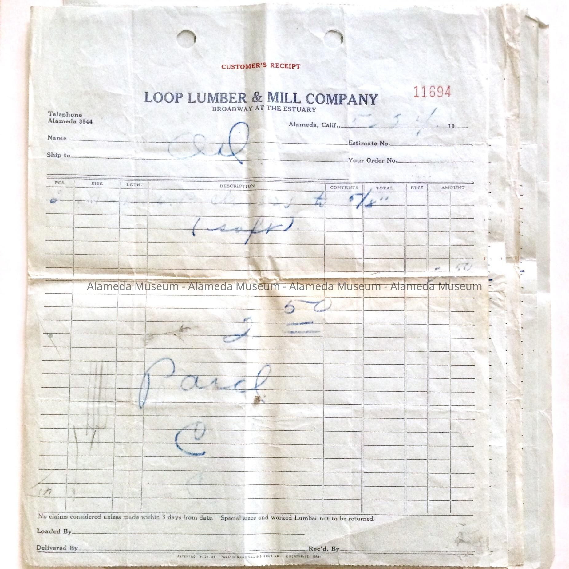 A RECEIPT FOR WOOD PURCHASED FROM LOOP LUMBER & MILL CO., BROADWAY, ALAMEDA.