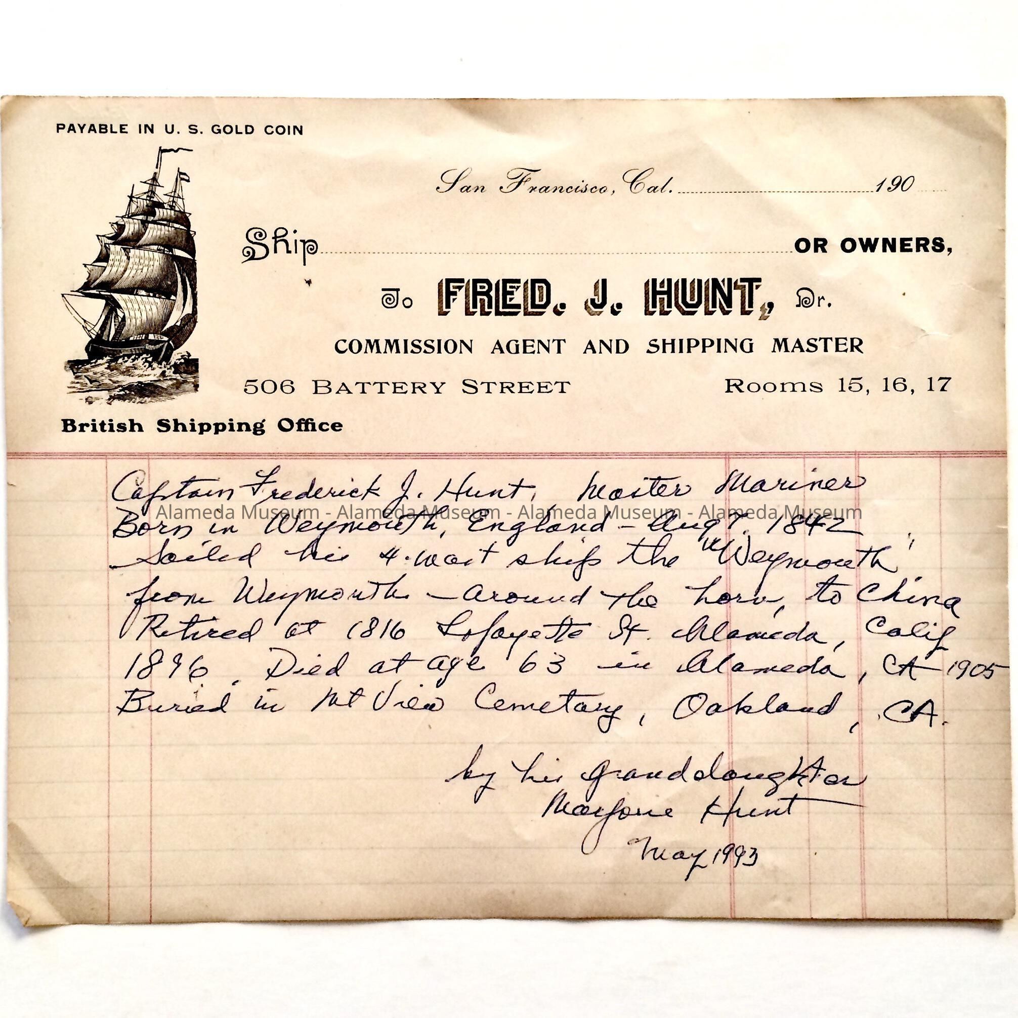 Stationery (receipt) of Fred. J. Hunt, commission agent de shipping master, 506 Battery St., S.F. Hunt purchased 1816 Lafayette Street, Alameda, in 1896 and occupied it until his death in 1905.