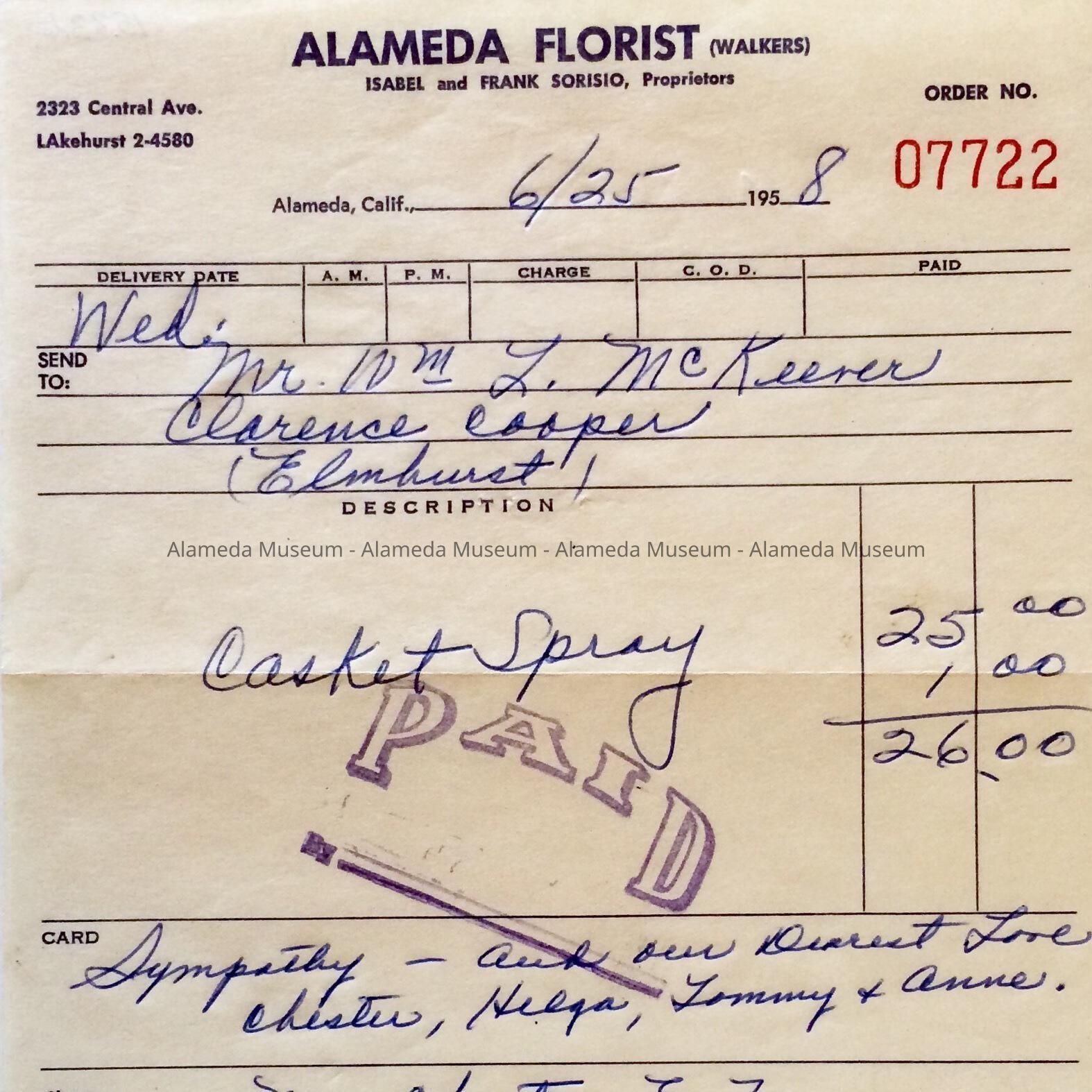 Receipt from Alameda Florist Shop, 2323 Central Ave., 1958Entry/Object ID