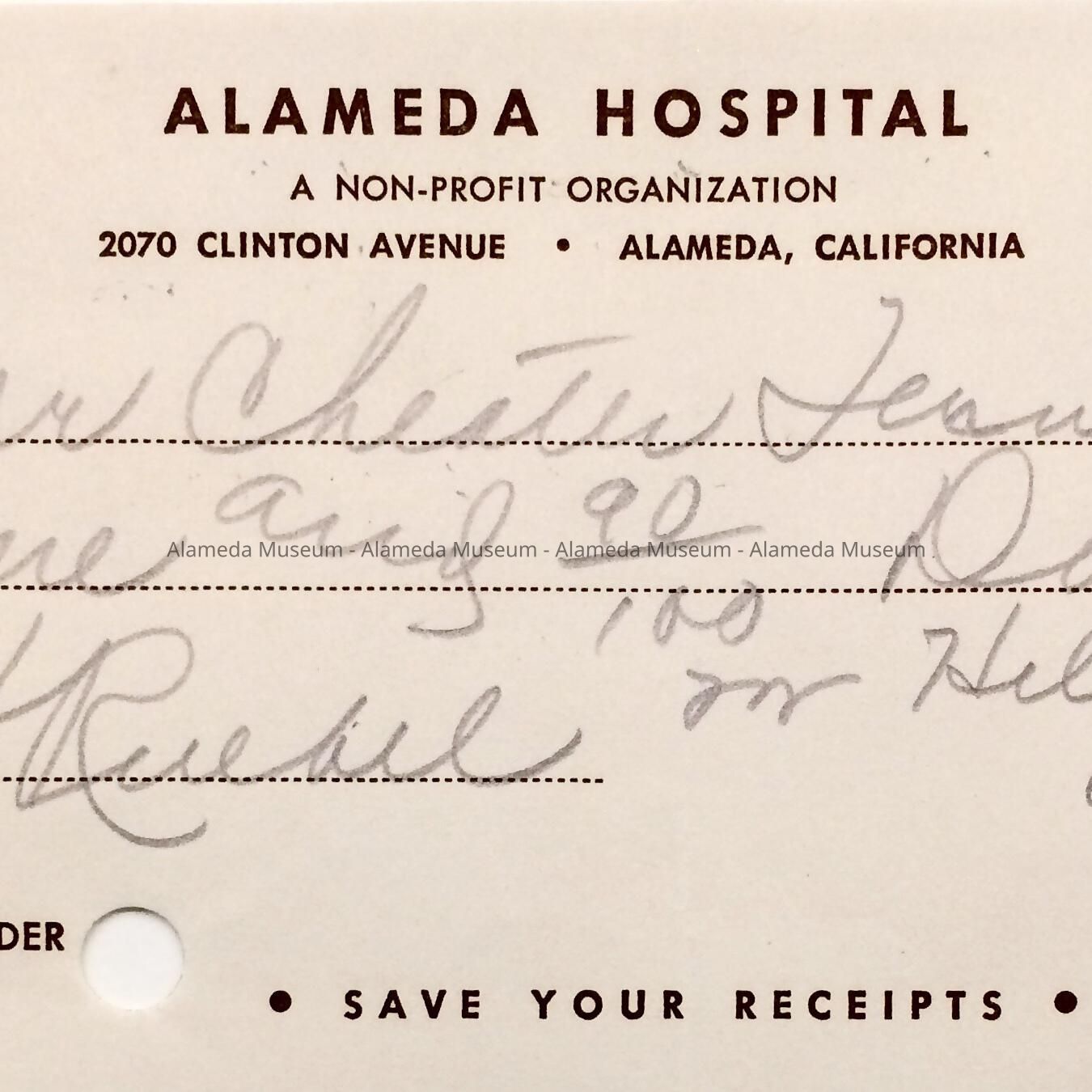DESCRIPTION: A RECEIPT FORM WITH BOLD-PRINTED CAPTION, "ALAMEDA HOSPITAL" IN BROWN-COLORED TYPE. INFORMATION BLANKS FILLED OUT BY HAND IN PENCIL.