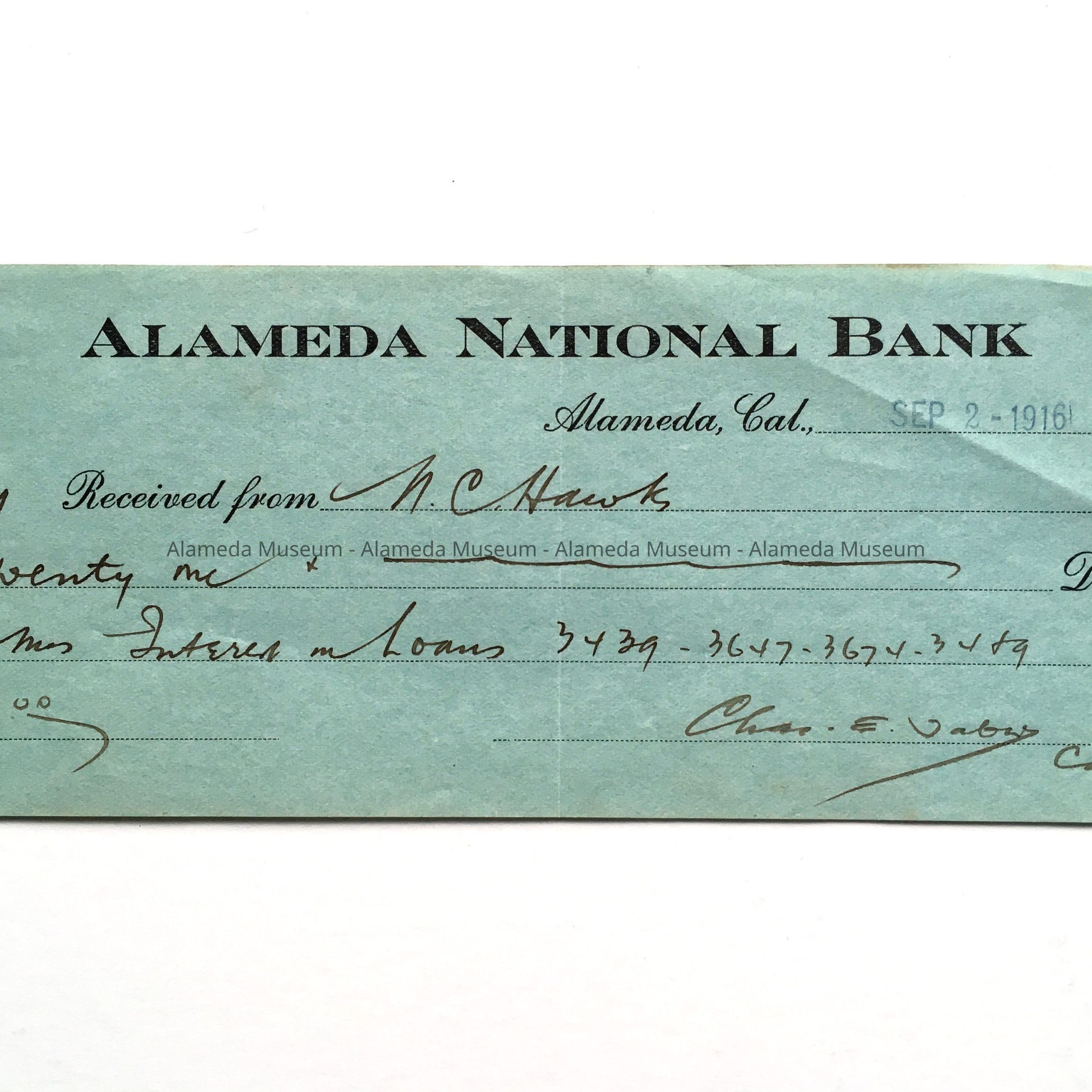 HISTORY OF OBJECT: RECEIPT FROM THE ALAMEDA NATIONAL BANK, DATED SEPTEMBER 2, 1916, TO NELSON C HAWKS.