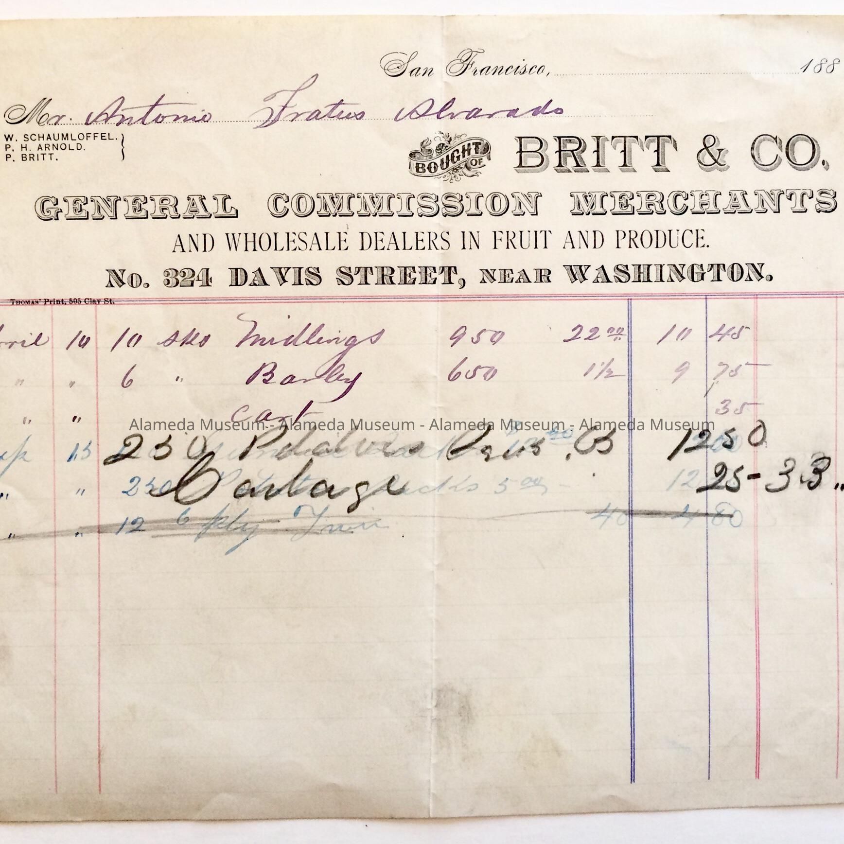 History of Object: Receipt from Britt & Co. General Commission Merchants, San Francisco, owned by Patrick Britt, Sr. early pioneer of Alameda.