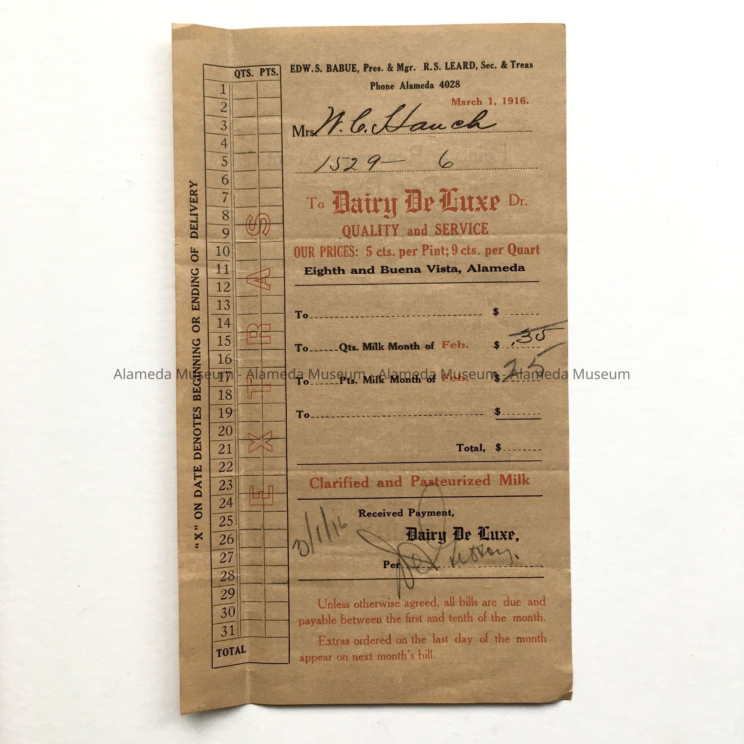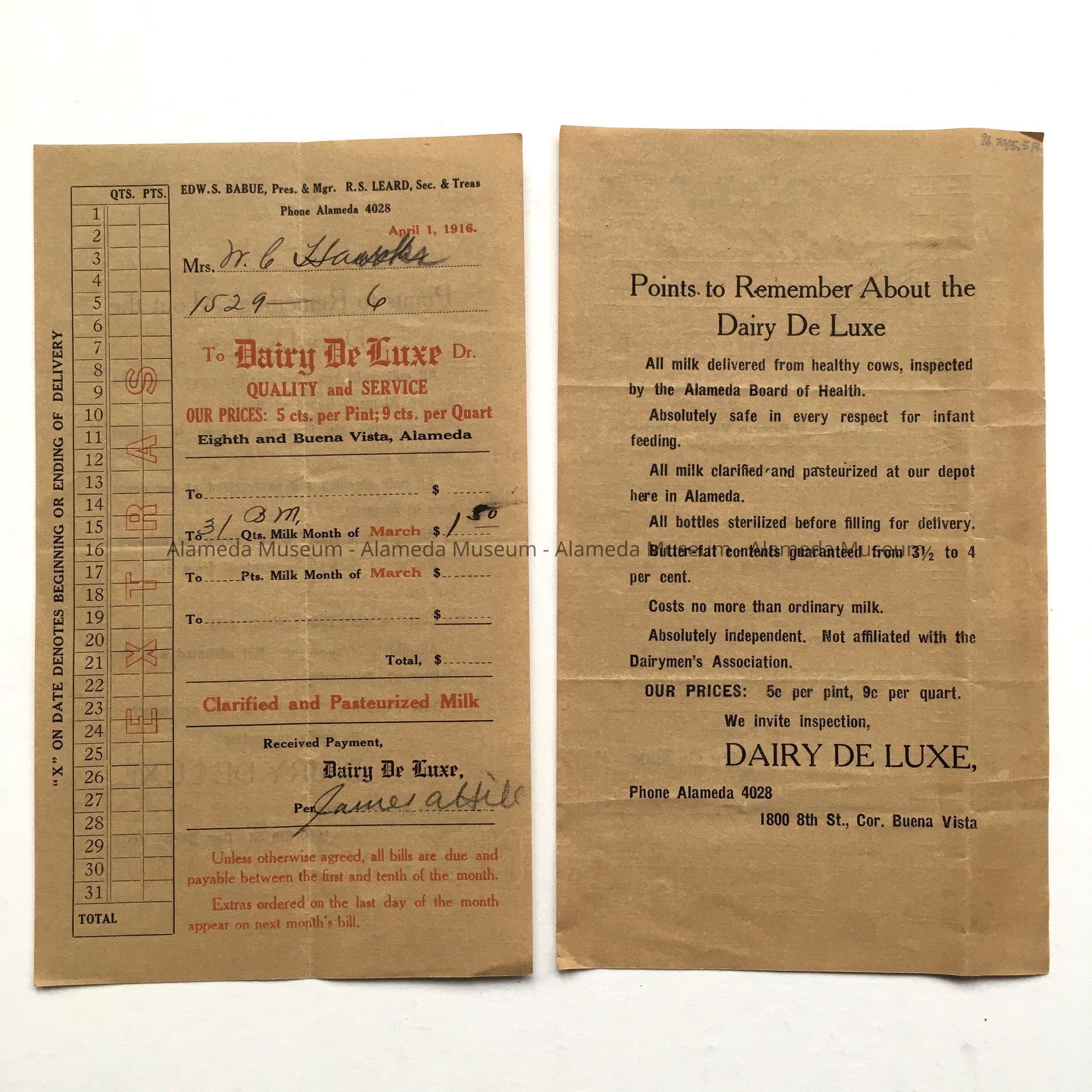 HISTORY OF OBJECT: RECEIPT FROM THE DAIRY DELUXE, EIGHTH STREET AND BUENA VISTA AVENUE, ALAMEDA, CALIFORNIA. ISSUED TO MRS NELSON C HAWKS, 1529 SIXTH STREET, ALAMEDA.