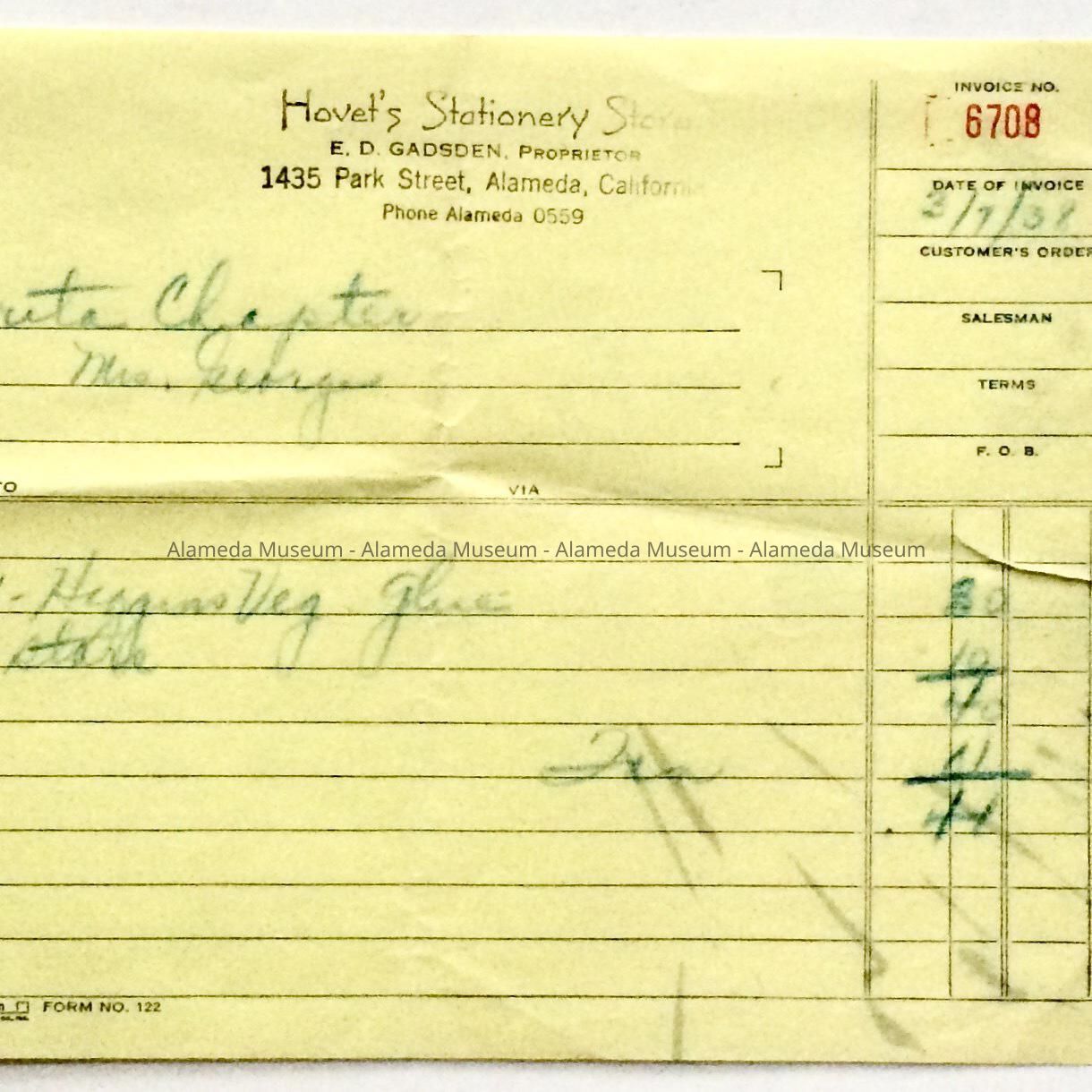 RECEIPT FROM HOVETS STATIONERY STORE, E. D. GADSDEN, PROPRIETOR, 1435 PARK STREET, ALAMEDA, CALIFORNIA. TELEPHONE: AL 0059.
