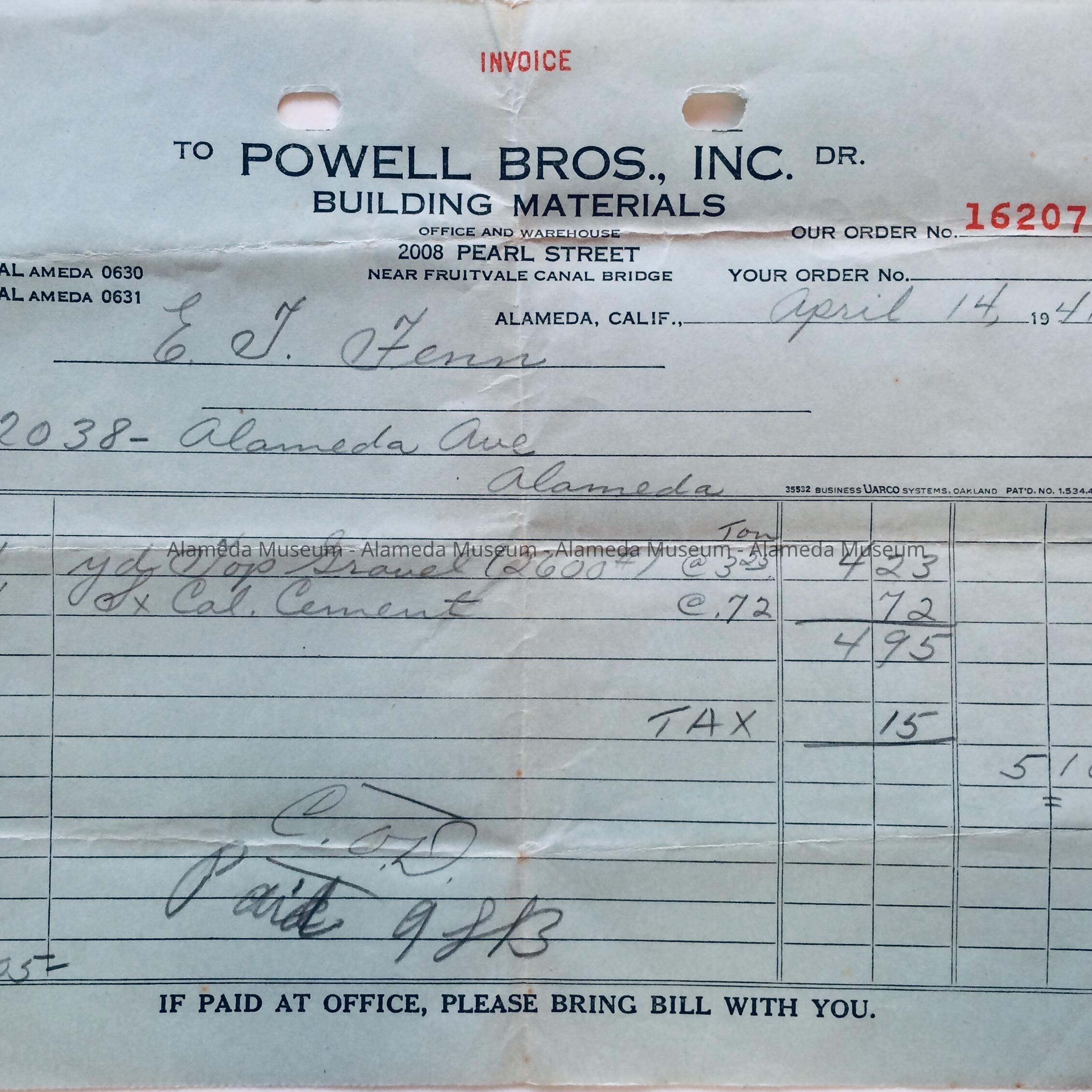 A RECEIPT FROM POWELL BROTHERS, INC., BUILDING MATERIALS, 2008 PEARL STREET, ALAMEDA.