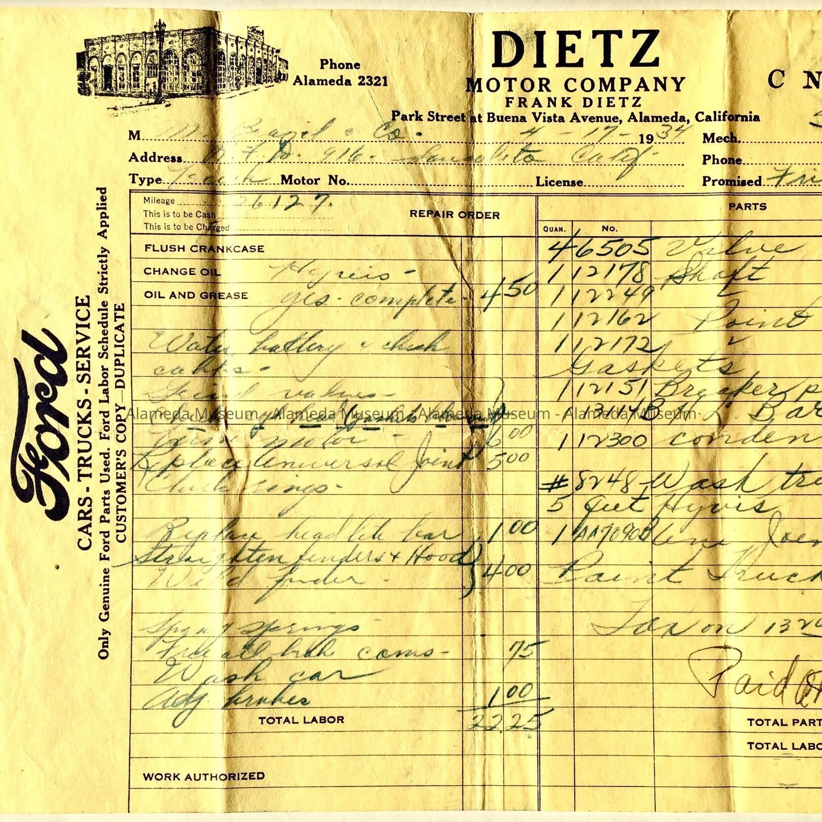 Receipt from the Dietz Motor Company, 1934Entry/Object ID