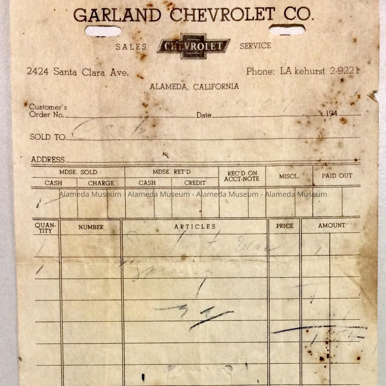 A RECEIPT FROM THE GARLAND CHEVROLET COMPANY, 2424 SANTA CLARA AVENUE, ALAMEDA, CA.