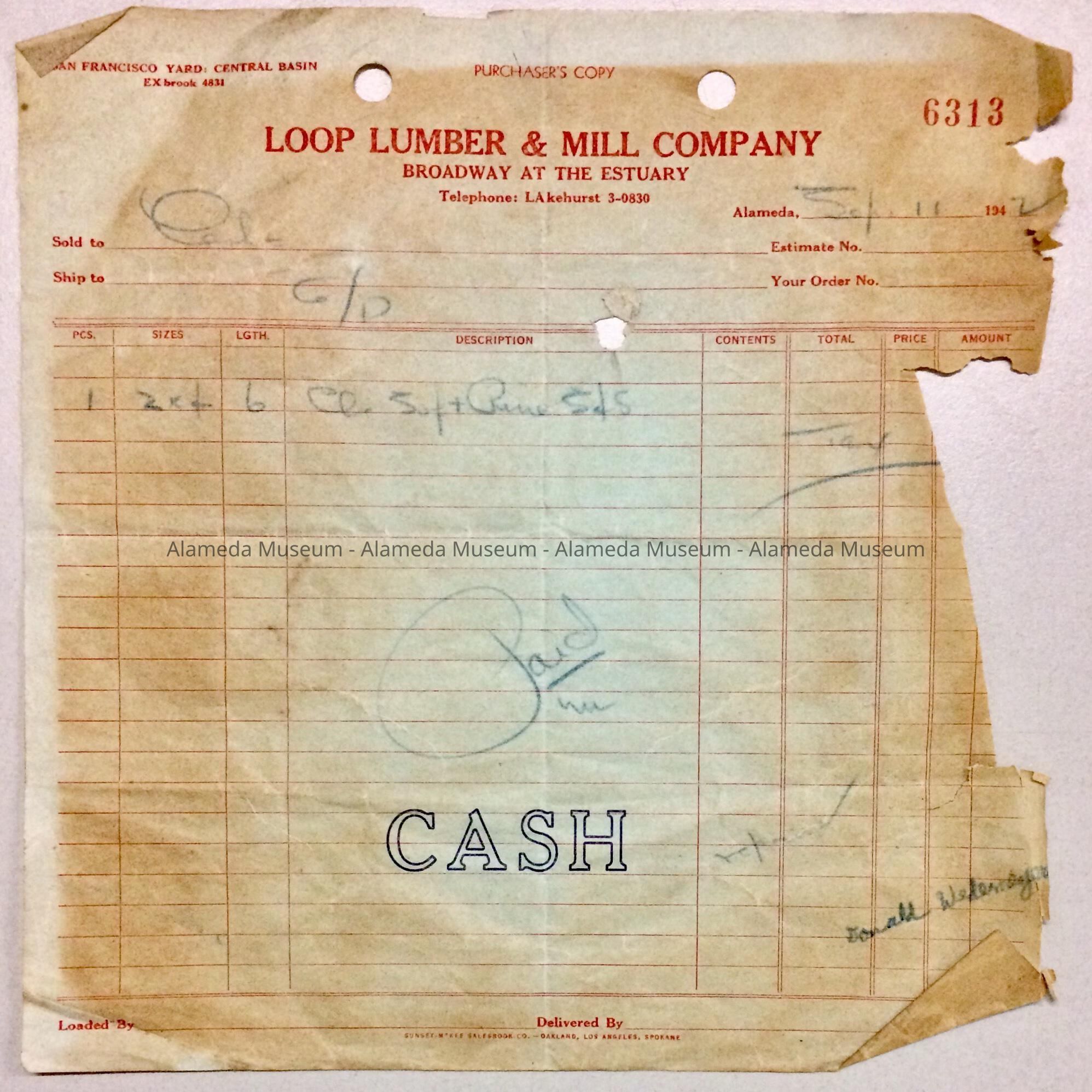 A RECEIPT FROM THE LOOP LUMBER AND MILL COMPANY, DATED SEPTEMBER 11, 1942.