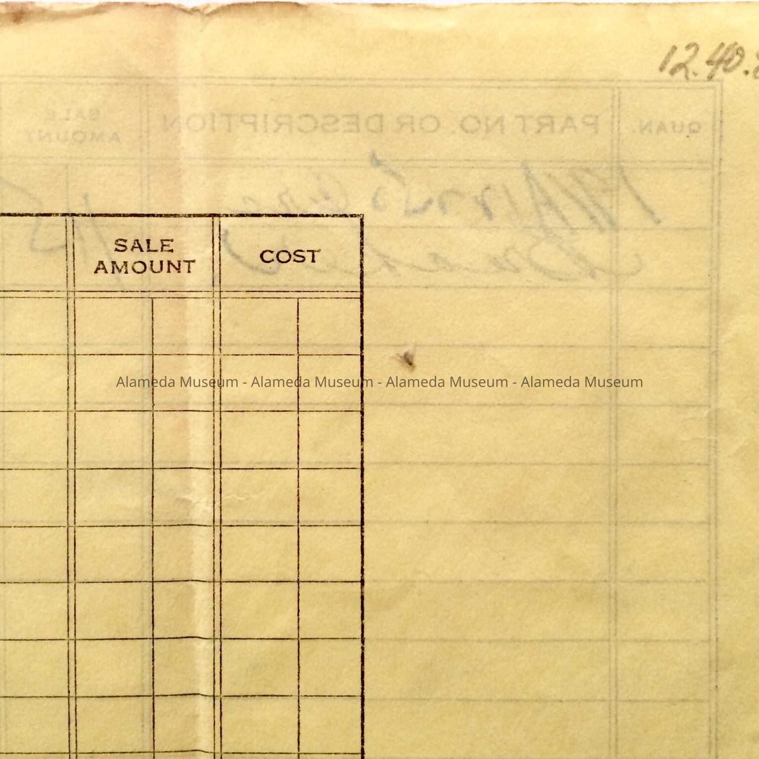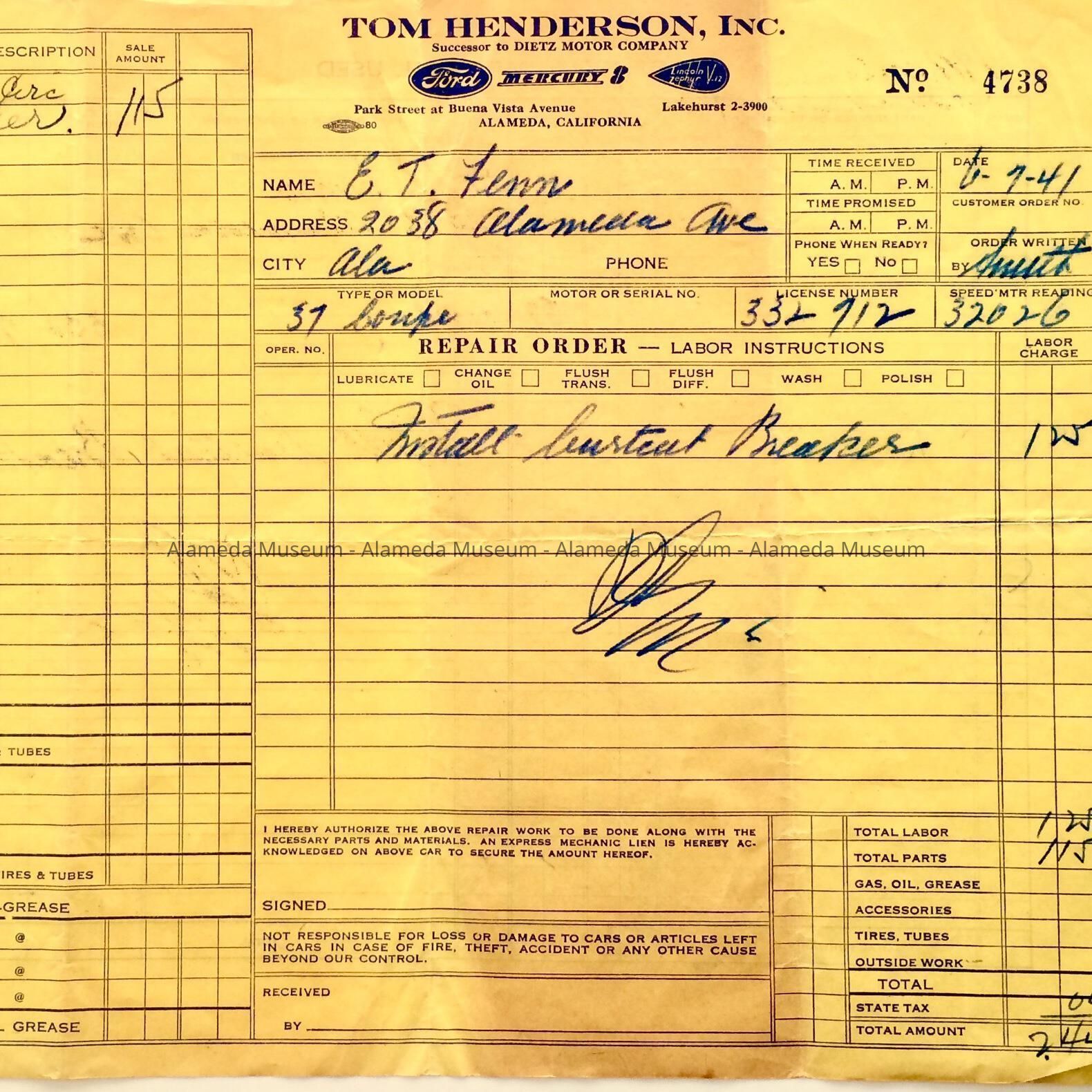 Receipt from Tom Henderson Inc., for auto service, 1941Entry/Object ID