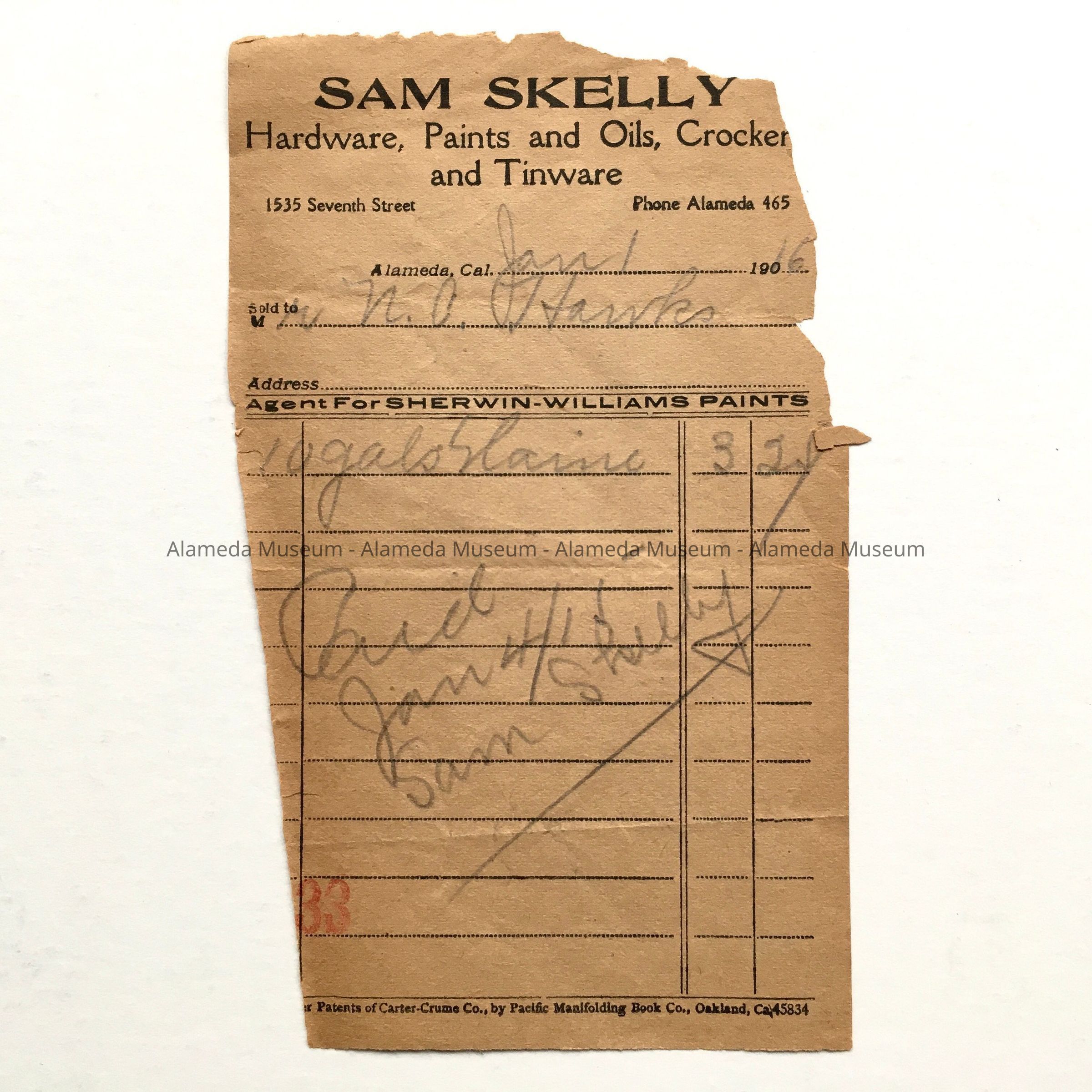 HISTORY OF OBJECT: RECEIPT ISSUED TO NELSON C HAWKS, FROM SAM SKELLY, HARDWARE, PAINTS, ETC., LOCATED AT 1535 SEVENTH STREET, ALAMEDA, CALIFORNIA.