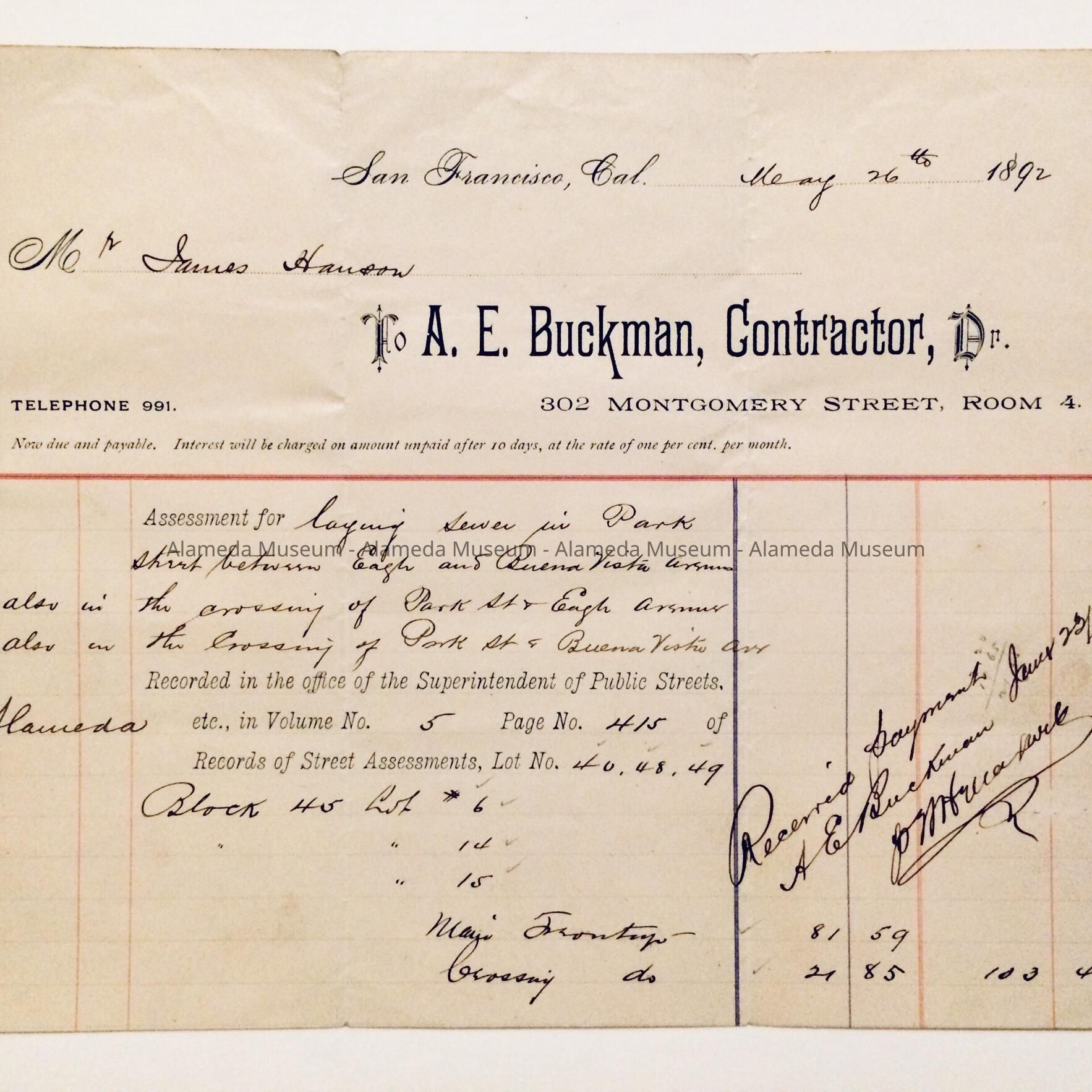 Receipt of payment from Mr. James Hanson to A. E. Buckman, dated May 26th, 1892, for the laying of sewer on Park Street between Eagle and Buena Vista Avenue.