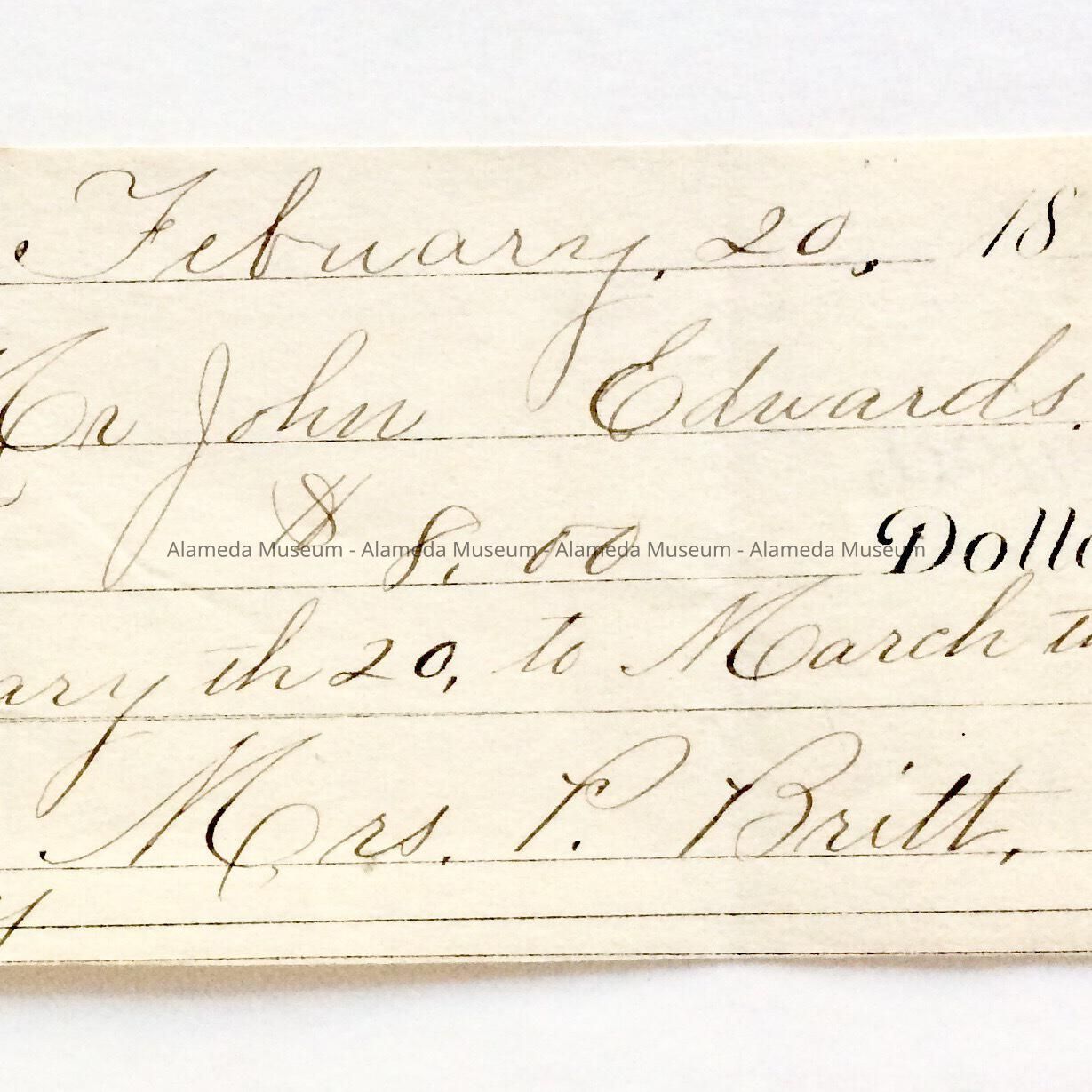 History of Object: A receipt from Mr. John Edwards for eight dollars from February 20th to March 20th received by Mrs. P. Britt on February 20, 1894